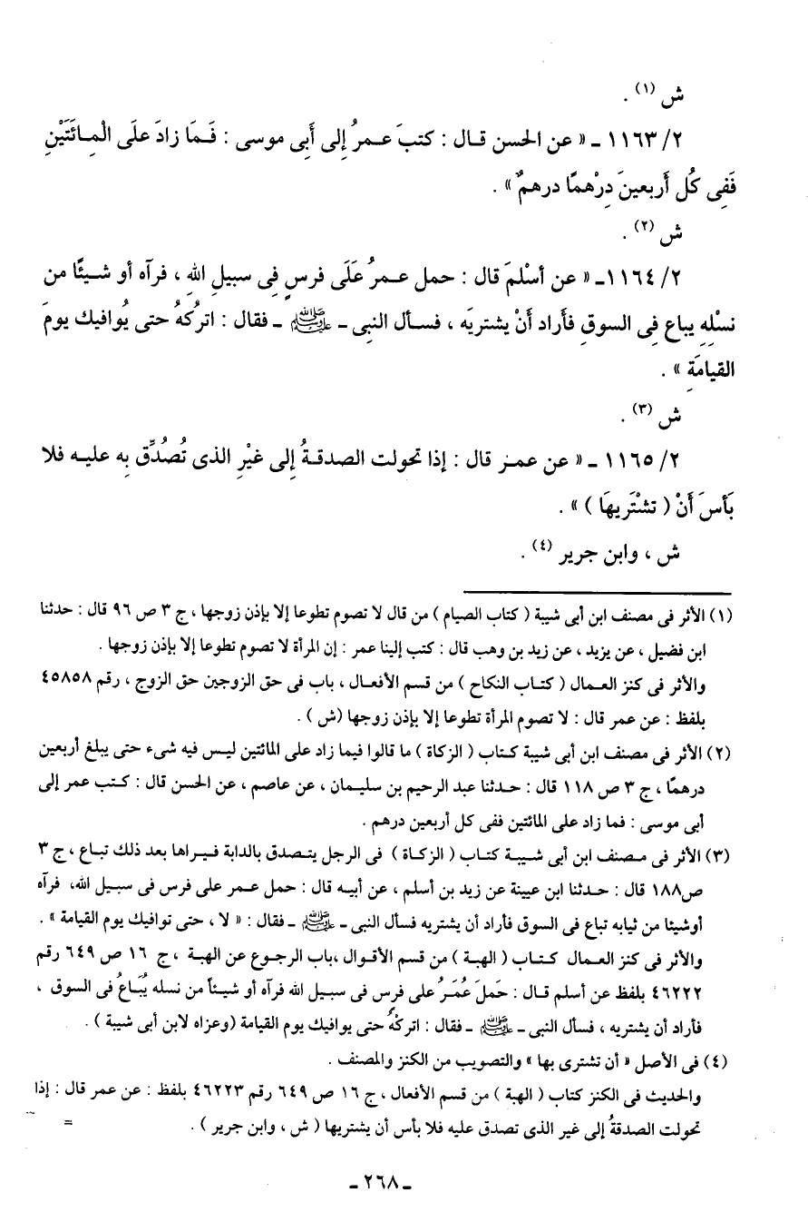 (¬3) الأثر في مصنف ابن أبى شيبة كتاب (الزكاة) في الرجل يتصدق بالدابة فيراها بعد ذلك تباع، ج 3 ص 188 قال: حدثنا ابن عيينة عن زيد بن أسلم، عن أبيه قال: حمل عمر على فرس في سبيل الله، فرآه أو شيئا من ثيابه تباع في السوق فأراد أن يشتريه فسأل النبى - صلى الله عليه وسلم - فقال: "لا، حتى توافيك يوم القيامة".