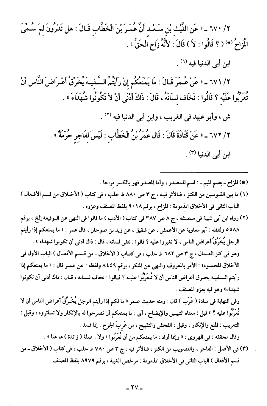 2/ 670 - "عَن اللَّيْثِ بْنِ سَعْدٍ أَنَّ عُمَرَ بْنَ الْخَطَّابِ قَالَ: هل تَدْرُونَ لِمَ سُمِّىَ المُزاحُ (*) (؟ قَالُوا: لَا) قَالَ: لأَنَّهُ زَاح الْحَقَّ".
