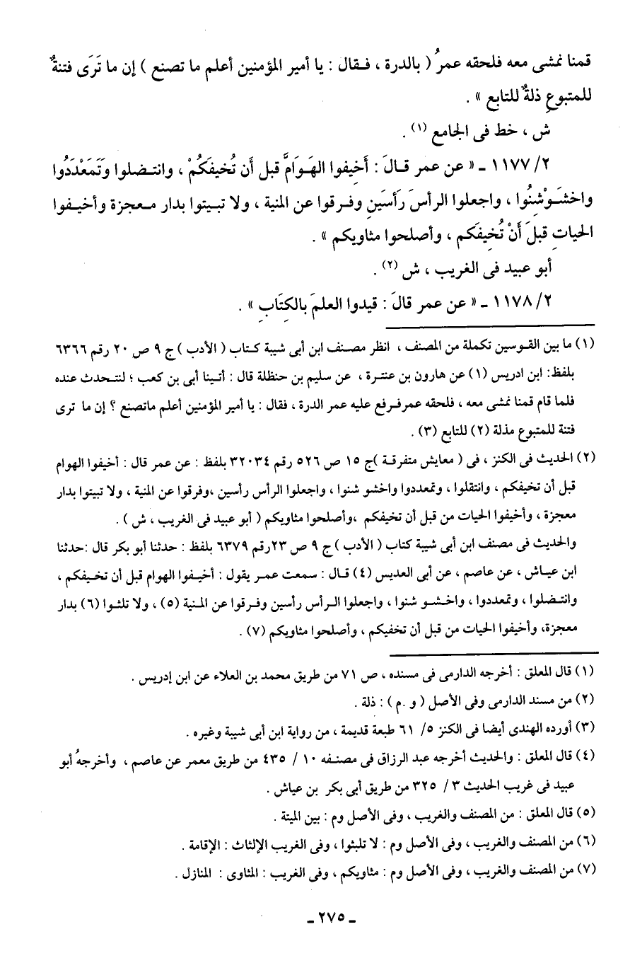 2/ 1178 - "عن عمر قالَ: قيدوا العلمَ بالكِتَابِ".