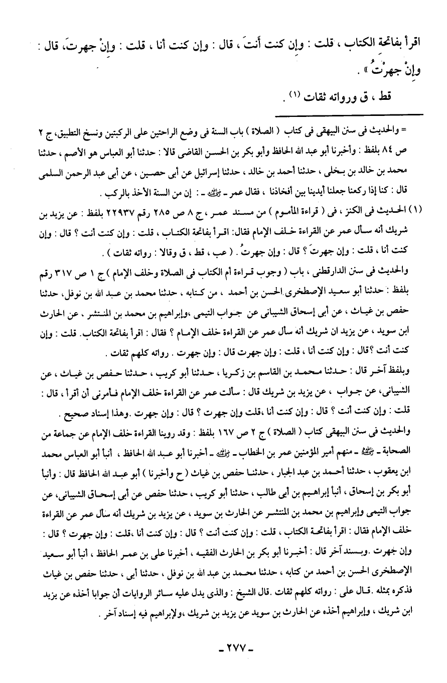 وبلفظ آخر قال: حدثنا محمد بن القاسم بن زكريا، حدثنا أبو كريب، حدثنا حفص بن غياث، عن الشيبانى، عن جواب، عن يزيد بن شريك قال: سألت عمر عن القراءة خلف الإمام فأمرنى أن أقرأ، قال: قلت: وإن كنت أنت؟ قال: وإن كنت أنا، قلت وإن جهرت؟ قال: وإن جهرت. وهذا إسناد صحيح.