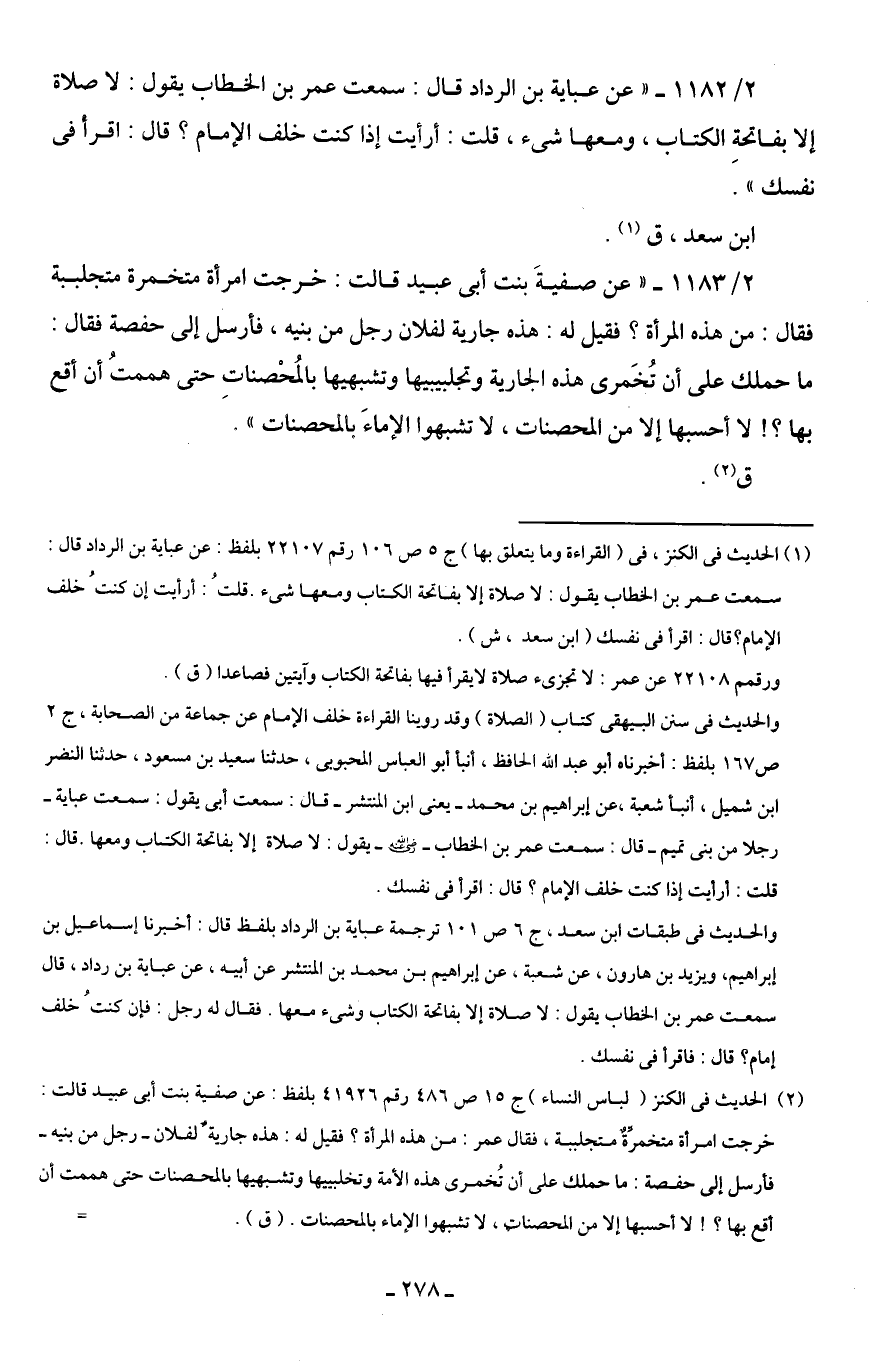 (¬1) الحديث في الكنز، في (القراءة وما يتعلق بها) ج 5 ص 106 رقم 22107 بلفظ: عن عباية بن الرداد قال: سمعت عمر بن الخطاب يقول: لا صلاة إلا بفاتحة الكتاب ومعها شئ. قلتُ: أرأيت إن كنتُ خلف الإمام؟ قال: اقرأ في نفسك (ابن سعد، ش).