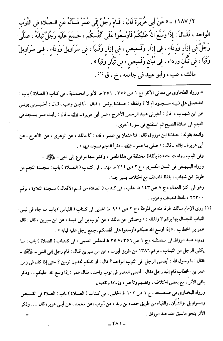 2/ 1187 - "عَنْ أَبِى هُرَيْرَةَ قَالَ: قَامَ رَجُلٌ إِلَى عُمَرَ فَسَأَلَهُ عَنِ الصَّلاةِ فِى الثَّوْبِ الْواحِدِ، فَقَالَ: إِذَا وَسَّعَ اللهُ عَليْكُمْ فَأَوْسِعُوا عَلَى أَنْفُسِكُم، جَمَعَ عَلَيْهِ رَجُلٌ ثِيابَهُ، صَلَّى رَجُلٌ فِى إِزَارٍ وَرِدَاءٍ، فِى إِزَارٍ وَقَمِيصٍ، فِى إِزَارٍ وَقَبَا، فِى سَرَاويلَ وَرِدَاءٍ، فِى سَرَاوِيلَ وَقَبَا، فِى تُبَّانٍ ورداء، فِى تُبَّانٍ وَقَمِيصٍ، فِى تُبَّانٍ وَقَبَا".