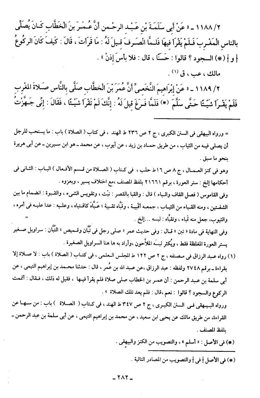2/ 1189 - "عَنْ إِبْرَاهِيمَ النَّخَعِىَّ أَنَّ عُمَرَ بْنَ الْخطَّابِ صَلَّى بِالنَّاس صَلاةَ المغْرِبِ فَلَمْ يَقْرَأ شَيْئًا حَتَّى سَلَّمَ (*) فَلَمَّا فَرَغَ قِيلَ لَهُ: إِنَّكَ لَمْ تَقْرَأ شَيْئًا، فَقَالَ: إِنَّى جَهَّزْتُ