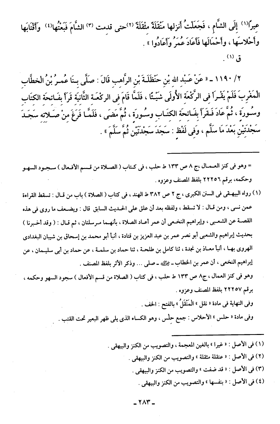 2/ 1190 - "عَنْ عَبْدِ اللهِ بْنِ حَنْظَلَةَ بْنِ الرَّاهِبِ قَالَ: صَلَّى بِنَا عُمرُ بْنُ الْخطَّابِ الْمَغْرِبَ فَلَمْ يَقْرَأ فِى الرَّكْعَةِ الأُولَى شَيْئًا، فَلَمَّا قَامَ فِى الركْعَةِ الثَّانِيَةِ قَرَأَ بِفَاتِحَةِ الكِتَابِ وسُورَةٍ، ثُمَّ عَادَ فَقَرَأَ بِفَاتِحَةِ الكِتَابِ وسُورَةٍ، ثُمَّ مَضَى، فَلَمَّا فَرَغَ مِنْ صَلاتِهِ سَجَدَ سَجْدَتَيْنِ بَعْدَ مَا سَلَّم، وَفِى لَفْظٍ: سَجَدَ سَجْدَتَيْن ثُمَّ سَلَّمَ".