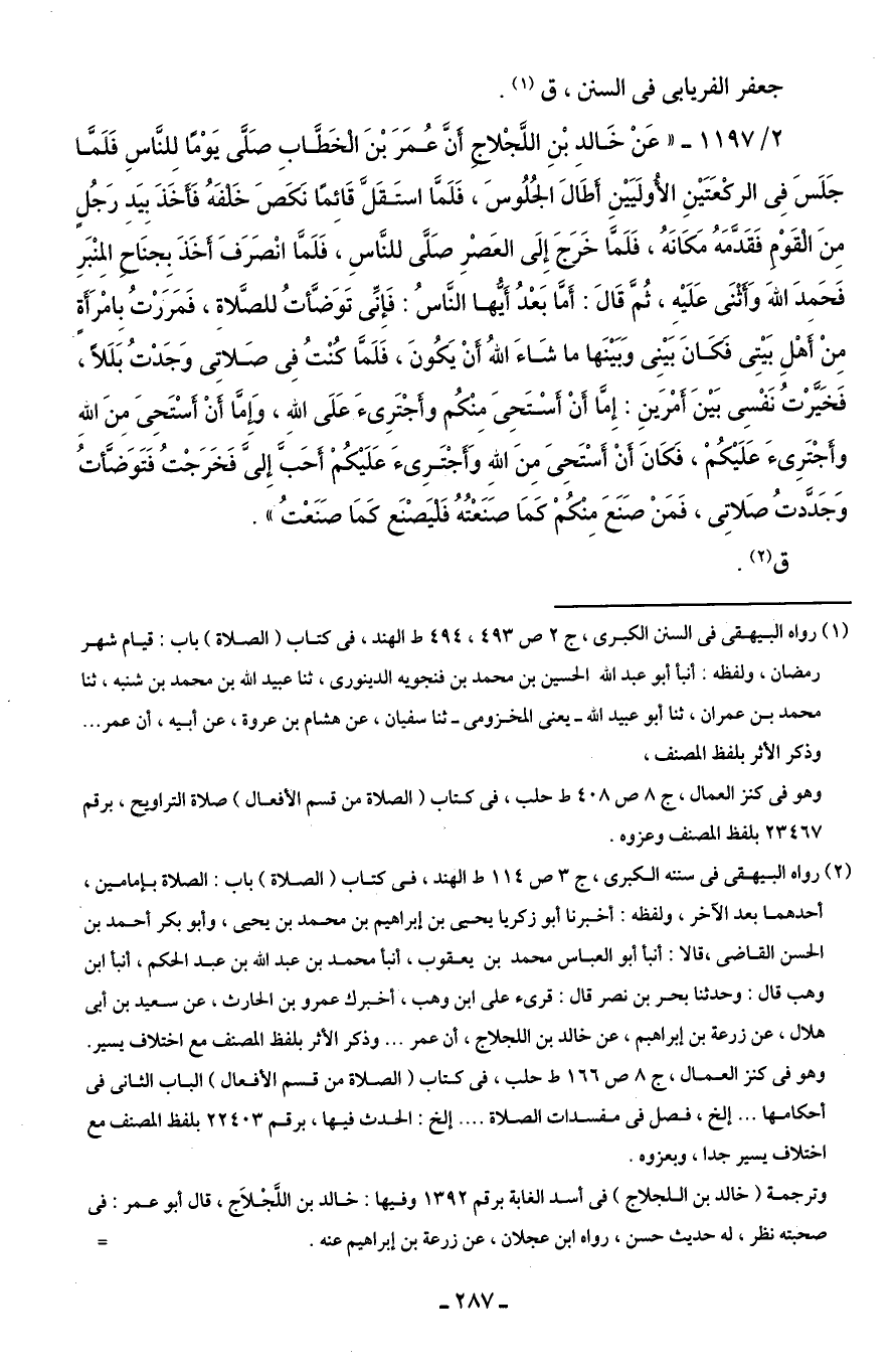 2/ 1197 - "عَنْ خَالدِ بْنِ اللَّجْلاجِ أَنَّ عُمَرَ بْنَ الْخَطَّابِ صَلَّى يَوْمًا لِلنَّاسِ فَلَمَّا جَلَسَ فِى الركْعَتَيْنِ الأُولَيَيْنِ أَطَالَ الجُلُوسَ، فَلَمَّا استَقَلَّ قَائِمًا نَكَصَ خَلْفَهُ فَأَخَذَ بِيَدِ رَجُلٍ مِنَ الْقَوْمِ فَقَدَّمَهُ مَكَانَهُ، فَلَمَّا خَرَجَ إِلَى العَصْرِ صَلَّى للنَّاسِ، فَلَمَّا انْصَرَفَ أَخَذَ بِجنَاحِ المِنْبَرِ فَحَمِدَ اللهَ وَأَثْنَى عَلَيْهِ، ثُمَّ قَالَ: أَمَّا بَعْدُ أَيُّها النَّاسُ: فَإِنِّى تَوَضَّأتُ للصَّلاةِ، فَمَرَرْتُ بِامْرَأَةٍ مِنْ أَهْلِ بَيْتِى فَكَانَ بَيْنِى وَبَيْنَها ما شَاءَ اللهُ أَنْ يَكُونَ، فَلَمَّا كُنْتُ فِى صَلاِتى وَجَدْتُ بَلَلًا، فَخَيَّرْتُ نَفْسِى بَيْنَ أَمْرَينِ: إِمَّا أنْ أَسْتَحِىَ مِنْكُم وأَجْتَرِئَ عَلَى اللهِ، وَإِمَّا أَنْ أَسْتَحِىَ مِنَ اللهِ وأَجْتَرِئَ عَلَيْكُمْ، فَكَانَ أَنْ أَسْتَحِىَ مِنَ اللهِ وَأَجْتَرِئَ عَلَيْكُمْ أَحَبَّ إِلىَّ فَخَرَجْتُ فَتَوَضَّأتُ وَجَدَّدتُ صَلاتِى، فَمَنْ صَنَعَ مِنْكُمْ كَمَا صَنَعْتُهُ فَليَصْنَع كَمَا صَنَعْتُ".