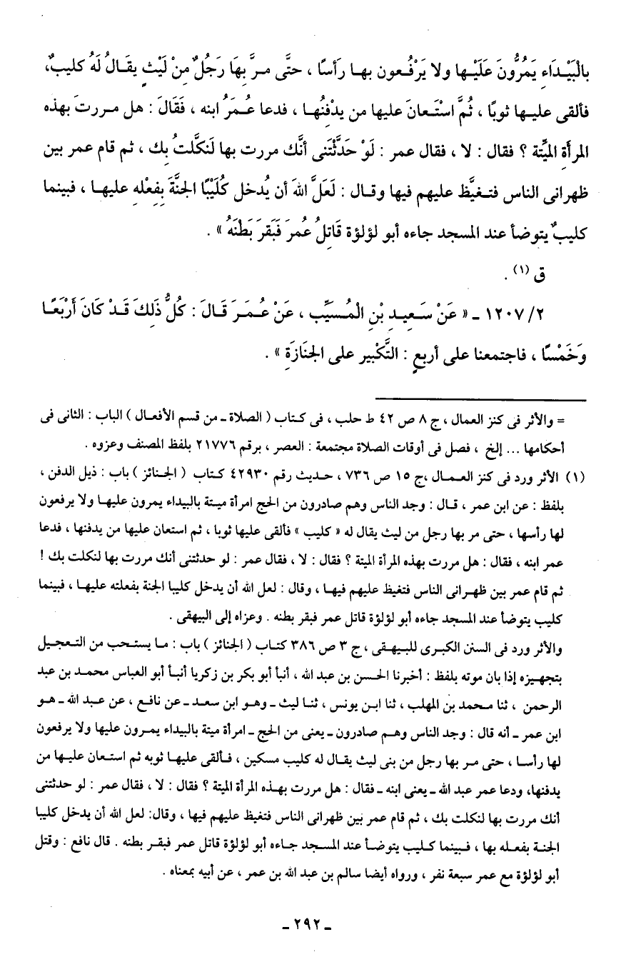 2/ 1207 - "عَنْ سَعِيدِ بْنِ الْمُسَيِّب، عَنْ عُمَرَ قَالَ: كُلُّ ذَلِكَ قَدْ كَانَ أَرْبَعًا وَخَمْسًا، فاجتمعنا على أربعٍ: التَّكْبير على الجنَازَةِ".