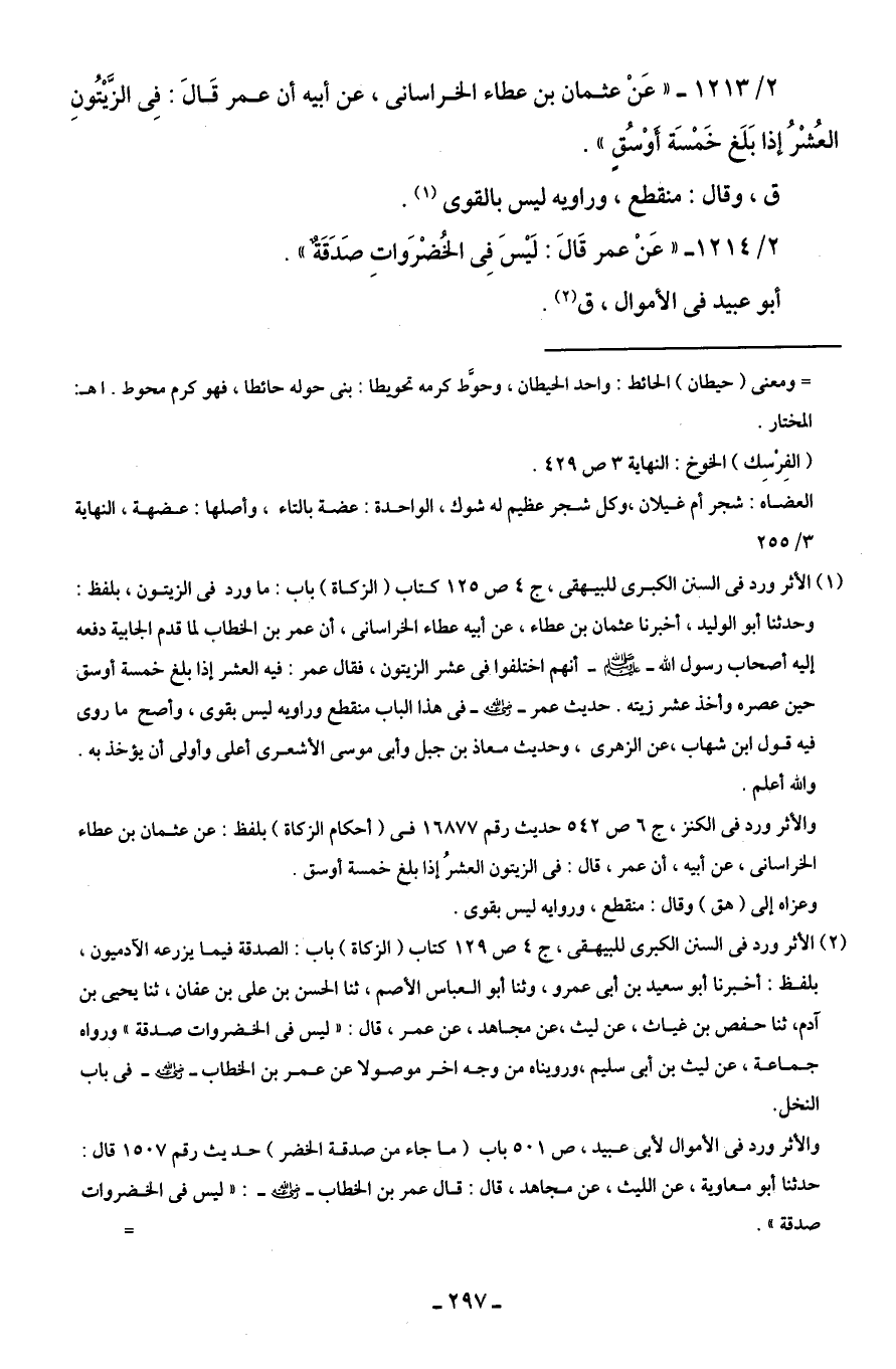 (¬2) الأثر ورد في السنن الكبرى للبيهقى، ج 4 ص 129 كتاب (الزكاة) باب: الصدقة فيما يزرعه الآدميون، بلفظ: أخبرنا أبو سعيد بن أبى عمرو، وثنا أبو العباس الأصم، ثنا الحسن بن على بن عفان، ثنا يحيى بن آدم، ثنا حفص بن غياث، عن ليث، عن مجاهد، عن عمر، قال: "ليس في الخضروات صدقة" ورواه جماعة، عن ليث بن أبى سليم، ورويناه من وجه آخر موصولا عن عمر بن الخطاب - رضي الله عنه - في باب النخل.
