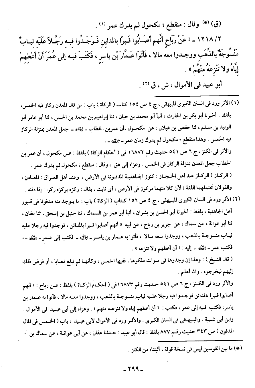 (¬2) الأثر ورد في السنن الكبرى للبيهقى، ج 4 ص 156 كتاب (الزكاة) باب: ما يوجد منه مدفونا في قبور أهل الجاهلية، بلفظ: أخبرنا أبو الحسن بن بشران، أنبأ أبو عمر بن السماك، ثنا حنبل بن إسحق، ثنا عفان، ثنا أبو عوانة، عن سماك، عن جرير بن رباح، عن أبيه "أنهم أصابوا قبرا بالمدائن، فوجدوا فيه رجلا عليه ثياب منسوجة بالذهب، ووجدوا معه مالا، فأتوا به عمار بن ياسر - رضي الله عنه - فكتب إلى عمر - رضي الله عنه -، فكتب عمر - رضي الله عنه - إليه: "أن أعطهم ولا تنزعه".