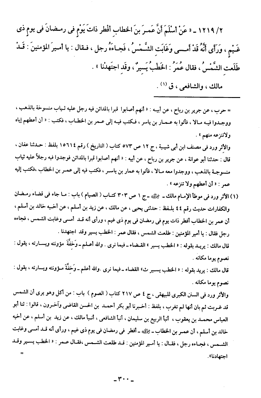 2/ 1219 - "عَنْ أسْلَمَ أَنَّ عَمرَ بنَ الخطابِ أفْطر ذاتَ يَوْمٍ في رمضانَ في يومٍ ذى غَيْمٍ، وَرَأَى أَنَّهُ قَدْ أمسى وَغَابَتِ الشَّمْسُ، فَجاءَهُ رجل، فقال: يا أميرَ المؤمنينَ: قَدْ طَلَعتِ الشَّمْسُ، فقال عُمَرُ: الخَطْبُ يَسِيرٌ، وقَدِ اجتَهدْنا".