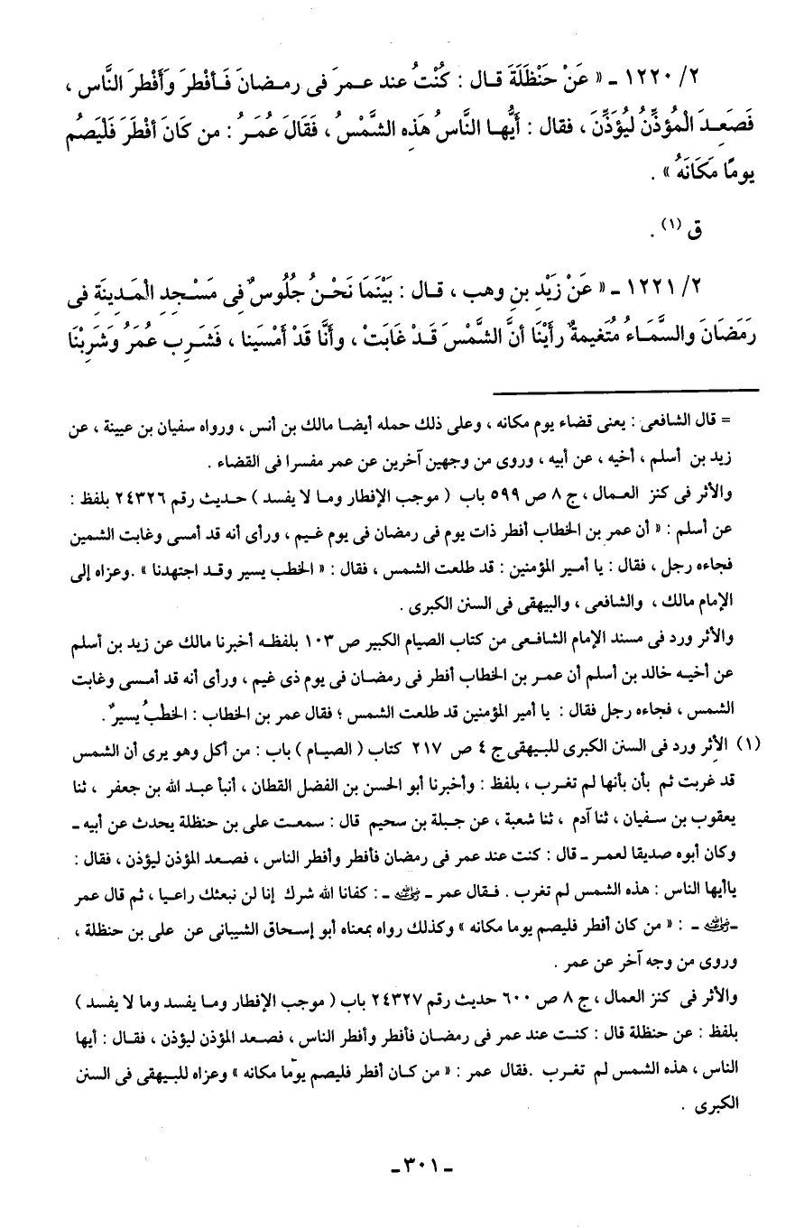 2/ 1220 - "عَنْ حَنْظَلَةَ قال: كُنْتُ عند عمرَ في رمضانَ فَأفْطرَ وَأَفْطرَ النَّاس، فَصَعِدَ الْمُؤذِّنُ ليُؤَذِّنَ، فقال: أَيُّها النَّاسُ هَذِه الشَّمْسُ، فَقَال عُمَرُ: من كَانَ أفْطَرَ فَلْيَصُم يومَا مَكَانَهُ".