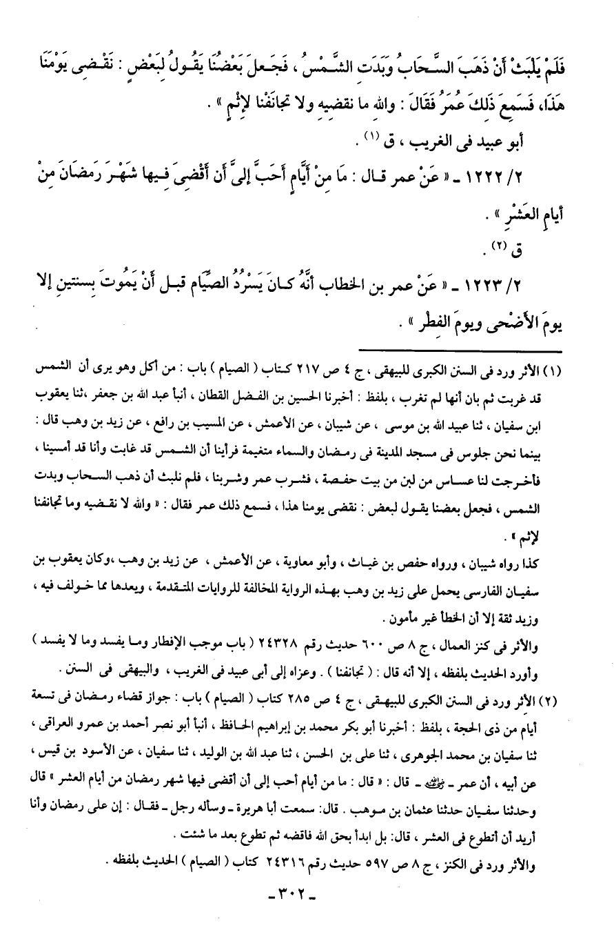 (¬2) الأثر ورد في السنن الكبرى للبيهقى، ج 4 ص 285 كتاب (الصيام) باب: جواز قضاء رمضان في تسعة أيام من ذى الحجة، بلفظ: أخبرنا أبو بكر محمد بن إبراهيم الحافظ، أنبأ أبو نصر أحمد بن عمرو العراقى، ثنا سفيان بن محمد الجوهرى، ثنا على بن الحسن، ثنا عبد الله بن الوليد، ثنا سفيان، عن الأسود بن قيس، عن أبيه، أن عمر - رضي الله عنه - قال: " قال: ما من أيام أحب إلى أن أقضى فيها شهر رمضان من أيام العشر" قال وحدثنا سفيان حدثنا عثمان بن موهب. قال: سمعت أبا هريرة - وسأله رجل - فقال: إن على رمضان وأنا أريد أن أتطوع في العشر، قال: بل ابدأ بحق الله فاقضه ثم تطوع بعد ما شئت.