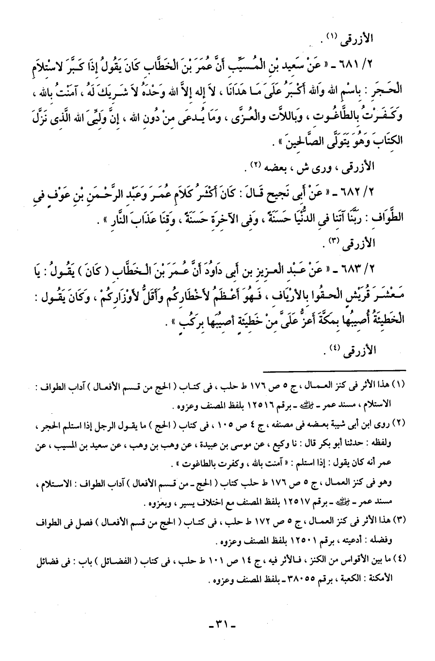 (¬1) هذا الأثر في كنز العمال، ج 5 ص 176 ط حلب، في كتاب (الحج من قسم الأفعال) آداب الطواف: الاستلام، مسند عمر - رضي الله عنه - برقم 12516 بلفظ المصنف وعزوه.