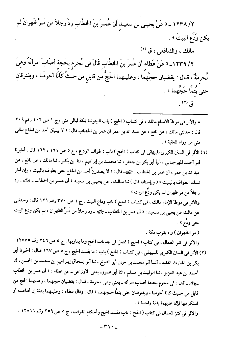 2/ 1238 - "عَنْ يحيى بن سعيدٍ أَن عُمرَ بنَ الخطَّابِ ردَّ رجلًا من مَرِّ ظَهرانَ لم يكن وَدَّع البيتَ".