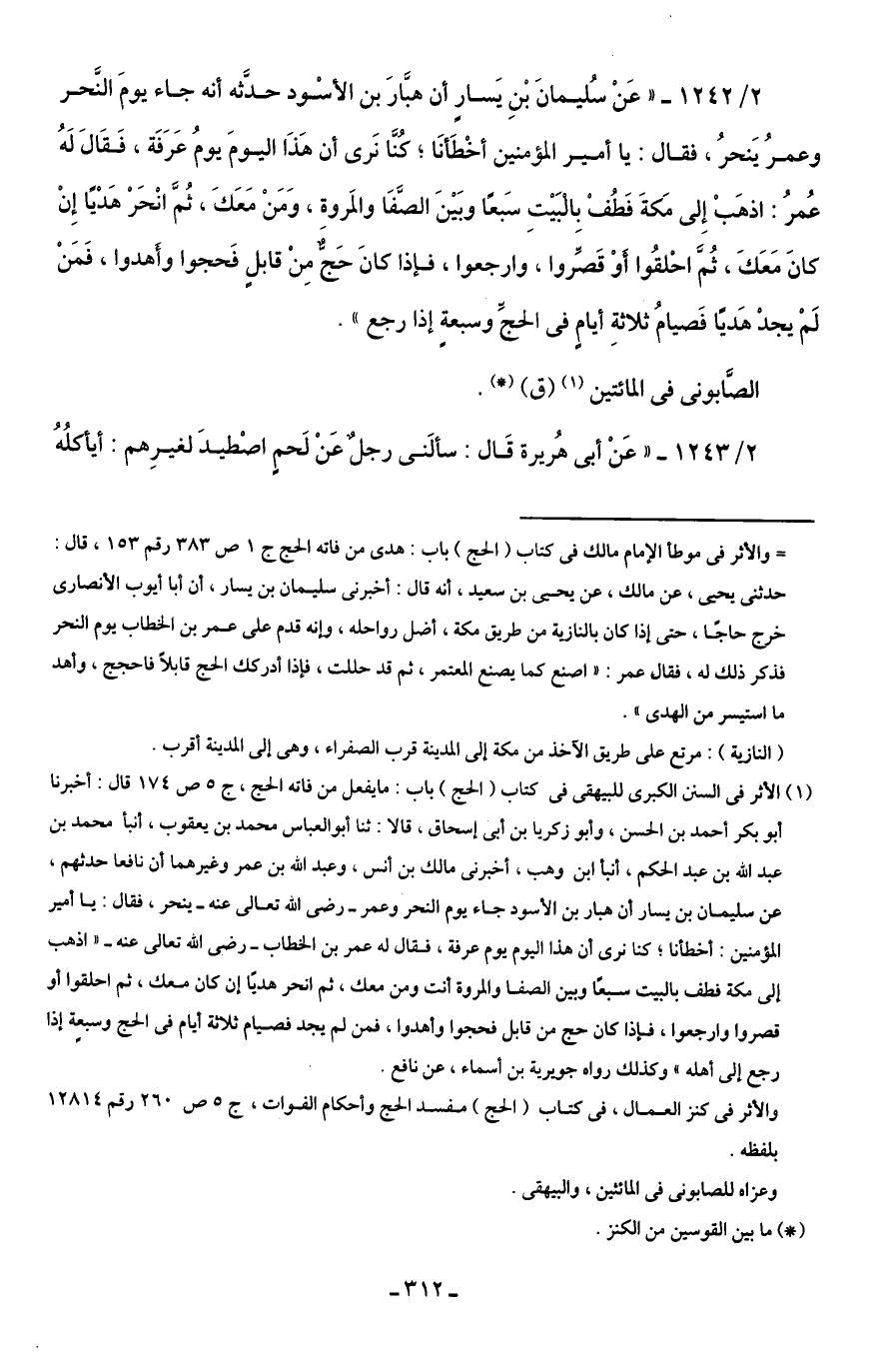 (¬1) الأثر في السنن الكبرى للبيهقى في كتاب (الحج) باب: ما يفعل من فاته الحج، ج 5 ص 174 قال: أخبرنا أبو بكر أحمد بن الحسن، وأبو زكريا بن أبي إسحاق، قالا: ثنا أبو العباس محمد بن يعقوب، أنبأ محمد بن عبد الله بن عبد الحكم، أنبأ ابن وهب، أخبرنى مالك بن أنس، وعبد الله بن عمر وغيرهما أن نافعا حدثهم، عن سليمان بن يسار أن هبار بن الأسود جاء يوم النحر وعمر - رضى الله تعالى عنه - ينحر، فقال: يا أمير المؤمنين: أخطأنا؛ كنا نرى أن هذا اليوم يوم عرفة، فقال له عمر بن الخطاب - رضى الله تعالى عنه - "اذهب إلى مكة فطف بالبيت سبعًا وبين الصفا والمروة أنت ومن معك، ثم انحر هديًا إن كان معك، ثم احلقوا أو قصروا وارجعوا، فإذا كان حج من قابل فحجوا وأهدوا، فمن لم يجد فصيام ثلاثة أيام في الحج وسبعةٍ إذا رجع إلى أهله" وكذلك رواه جويرية بن أسماء، عن نافع.