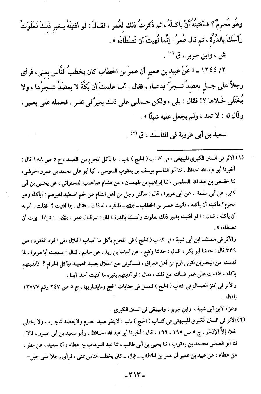 (¬1) الأثر في السنن الكبرى للبيهقى، في كتاب (الحج) باب: ما يأكل المحرم من الصيد، ج 5 ص 188 قال: أخبرنا أبو عبد الله الحافظ، ثنا أبو القاسم يوسف بن يعقوب السوسى، أنبأ أبو على محمد بن عمرو الحرشى، ثنا حفص بن عبد الله السلمى، ثنا إبراهيم بن طهمان، عن هشام صاحب الدستوائى، عن يحيى بن أبى كثير، عن أبي سلمة، عن أبي هريرة، قال: سألنى رجل من أهل الشام عن لحم اصطيد لغيرهم: أيأكله وهو محرم؟ فأفتيته أن يأكله، فأتيت عمر بن الخطاب - رضي الله عنه - فذكرت له ذلك، فقال: بما أفتيت؟ فقلت: أمرته أن يأكله، قال: "لو أفتيته بغير ذلك لعلوت رأسك بالدرة" قال: ثم قال عمر - رضي الله عنه -: "إنما نهيت أن تصطاده".