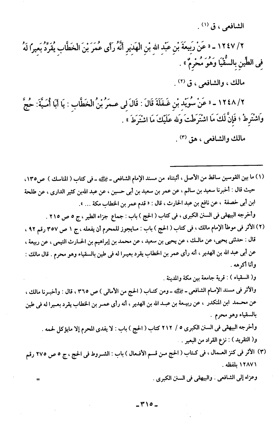 2/ 1247 - "عَنْ رَبِيعَةَ بْنِ عَبْدِ اللهِ بْنِ الْهَدِيرِ أَنَّهُ رَأَى عُمَرَ بْنَ الْخَطَّابِ يُقَرِّدُ بَعِيرًا لَهُ في الطِّينِ بِالسُّقْيَا وَهُوَ مُحْرِمٌ".