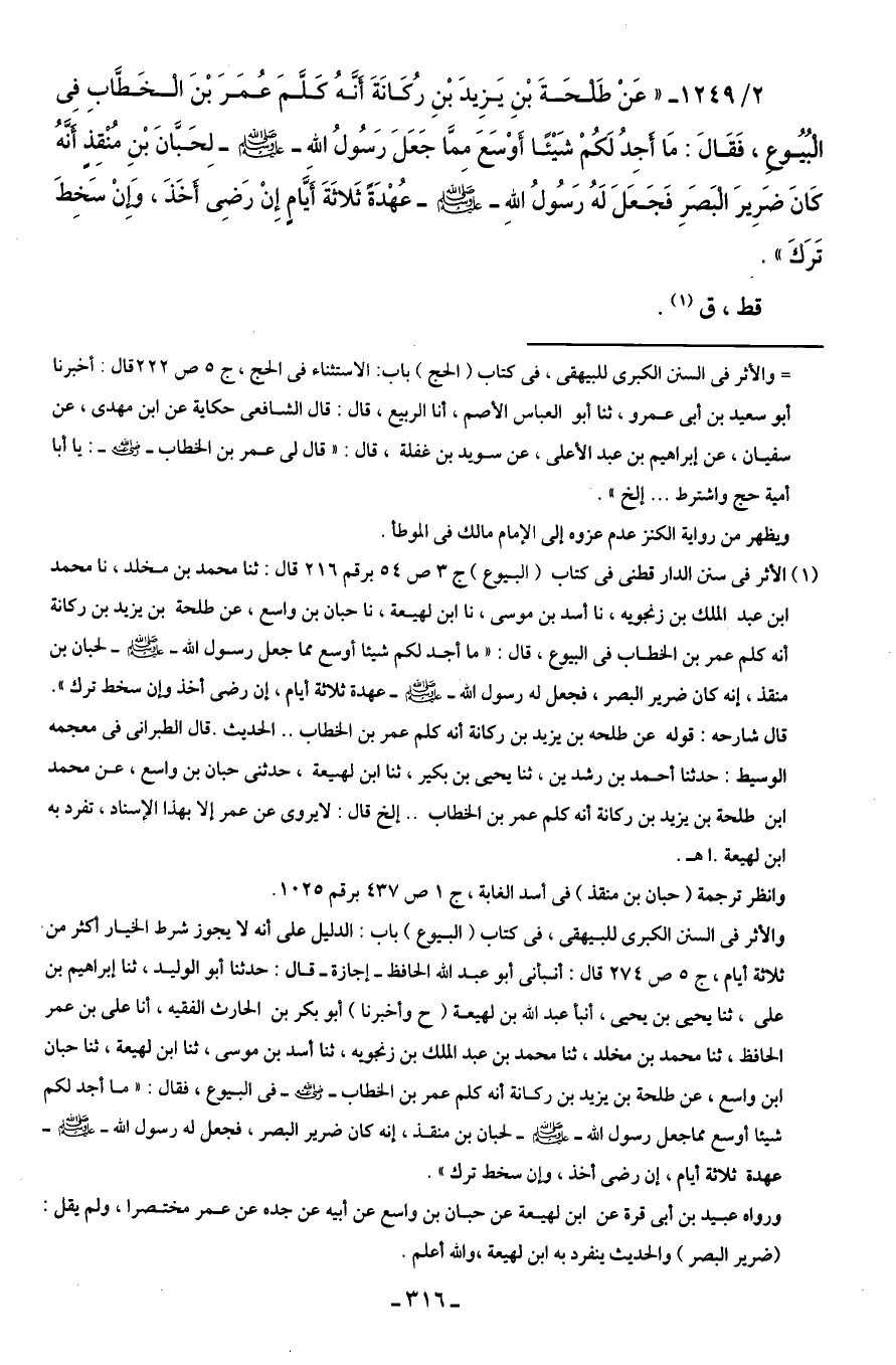 (¬1) الأثر في سنن الدارقطنى في كتاب (البيوع) ج 3 ص 54 برقم 216 قال: ثنا محمد بن مخلد، نا محمد بن عبد الملك بن زنجويه، نا أسد بن موسى، نا ابن لهيعة، نا حبان بن واسع، عن طلحة بن يزيد بن ركانة أنه كلم عمر بن الخطاب في البيوع، قال: "ما أجد لكم شيئا أوسع مما جعل رسول الله - صلى الله عليه وسلم - لحبان بن منقذ، إنه كان ضرير البصر، فجعل له رسول الله - صلى الله عليه وسلم - عهدة ثلاثة أيام، إن رضى أخذ وإن سخط ترك". قال شارحه: قوله عن طلحه بن يزيد بن ركانة أنه كلم عمر بن الخطاب .. الحديث. قال الطبرانى في معجمه الوسيط: حدثنا أحمد بن رشدين، ثنا يحيى بن بكير، ثنا ابن لهية، حدثنى حبان بن واسع، عن محمد بن طلحة بن يزيد بن ركانة أنه كلم عمر بن الخطاب .. إلخ قال: لا يروى عن عمر إلا بهذا الإسناد، تفرد به ابن لهيعة. اهـ.