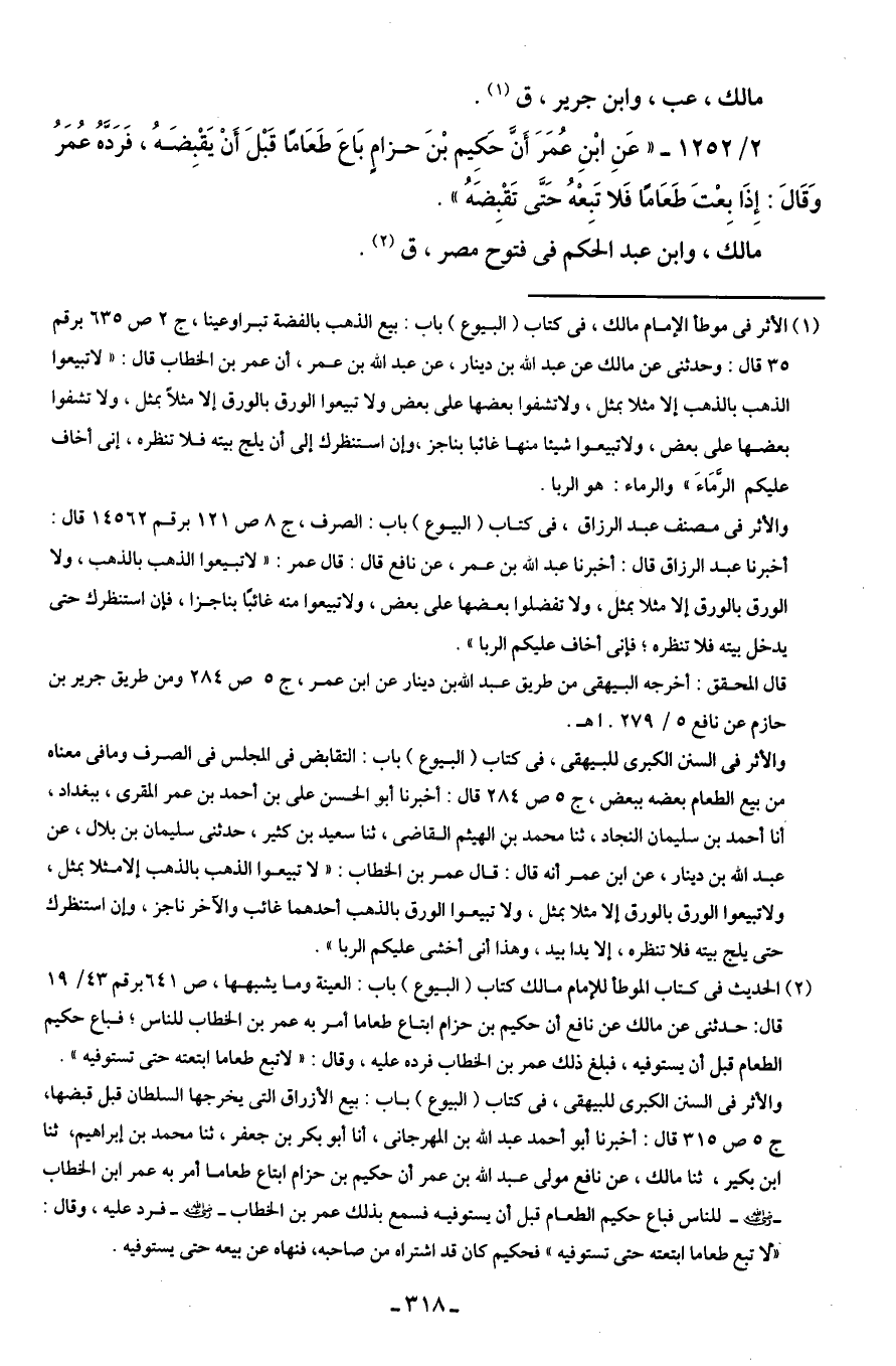 (¬2) الحديث في كتاب الموطأ للإمام مالك كتاب (البيوع) باب: العينة وما يشبهها، ص 641 برقم 43/ 19 قال: حدثنى عن مالك عن نافع أن حكيم بن حزام ابتاع طعاما أمر به عمر بن الخطاب للناس؛ فباع حكيم الطعام قبل أن يستوفيه، فبلغ ذلك عمر بن الخطاب فرده عليه، وقال: "لا تبع طعاما ابتعته حتى تستوفيه". والأثر في السنن الكبرى للبيهقى، في كتاب (البيوع) باب: بيع الأزراق التى يخرجها السلطان قبل قبضها، ج 5 ص 315 قال: أخبرنا أبو أحمد عبد الله بن المهرجانى، أنا أبو بكر بن جعفر، ثنا محمد بن إبراهيم، ثنا ابن بكير، ثنا مالك، عن نافع مولى عبد الله بن عمر أن حكيم بن حزام ابتاع طعاما أمر به عمر بن الخطاب - رضي الله عنه - للناس فباع حكيم الطعام قبل أن يستوفيه فسمع بذلك عمر بن الخطاب - رضي الله عنه - فرد عليه، وقال: "لا تبع طعاما ابتعته حتى تستوفيه" فحكيم كان قد اشتراه من صاحبه، فنهاه عن بيعه حتى يستوفيه.