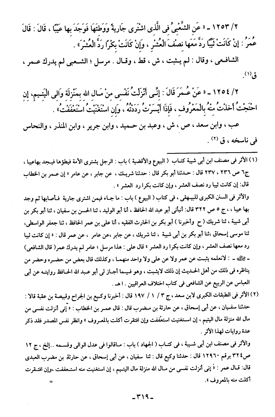 (¬2) الأثر في الطبقات الكبرى لابن سعد، ج 3/ 1/ 197 قال: أخبرنا وكيع بن الجراح وقبيصة بن عقبة قالا: حدثنا سفيان، عن أبي إسحاق، عن حارثة بن مضرب قال: قال عمر بن الخطاب: "إنى أنزلت نفسى من مال الله منزلة مال اليتيم، إن استغنيت استعْففت وإن افتقرت أكلت بالمعروف" وانظر نفس المصدر فقد ذكر عدة روايات لهذا الأثر.