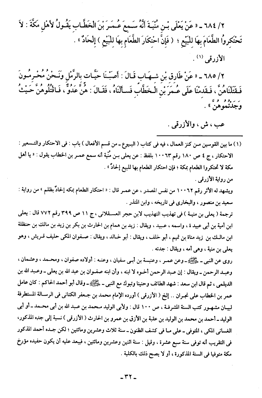 (¬1) ما بين القوسين من كنز العمال، فيه في كتاب (البيوع - من قسم الأفعال) باب: في الاحتكار والتسعير: الاحتكار، ج 4 ص 180 رقم 10063 بلفظ: عن يعلى بن مُنْية أنه سمع عمر بن الخطاب يقول: "يا أهل مكة لا تحتكروا الطعام بمكة؛ فإن احتكار الطعام بها للبيع إلحادٌ".