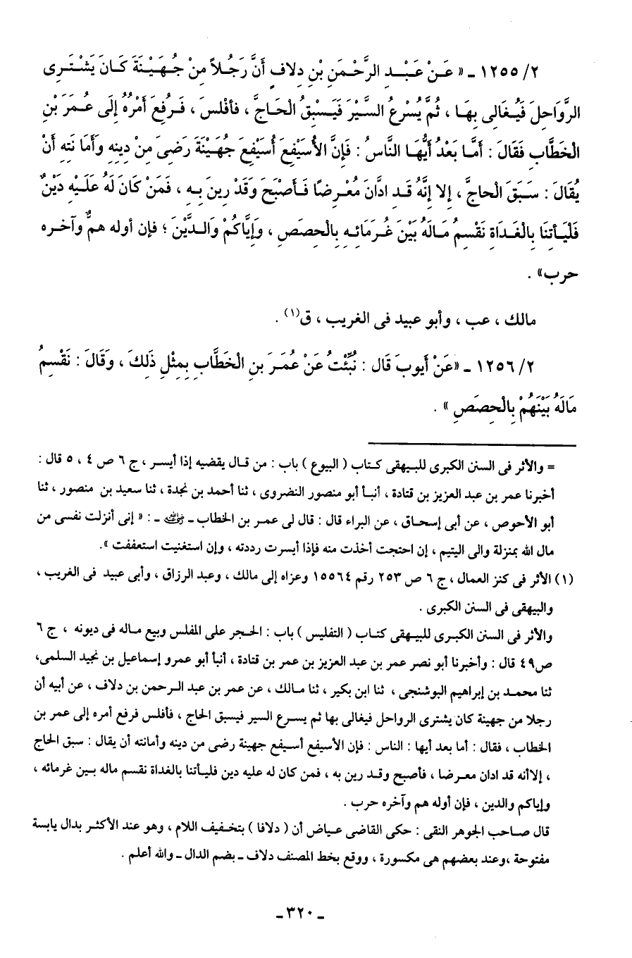 2/ 1256 - "عَنْ أَيوبَ قَال: نُبِّئْتُ عَنْ عُمَرَ بنِ الْخَطَّابِ بِمِثْلِ ذَلِكَ، وَقَالَ: نَقْسِمُ مَالَهُ بَيْنَهُمْ بِالْحِصَصِ".