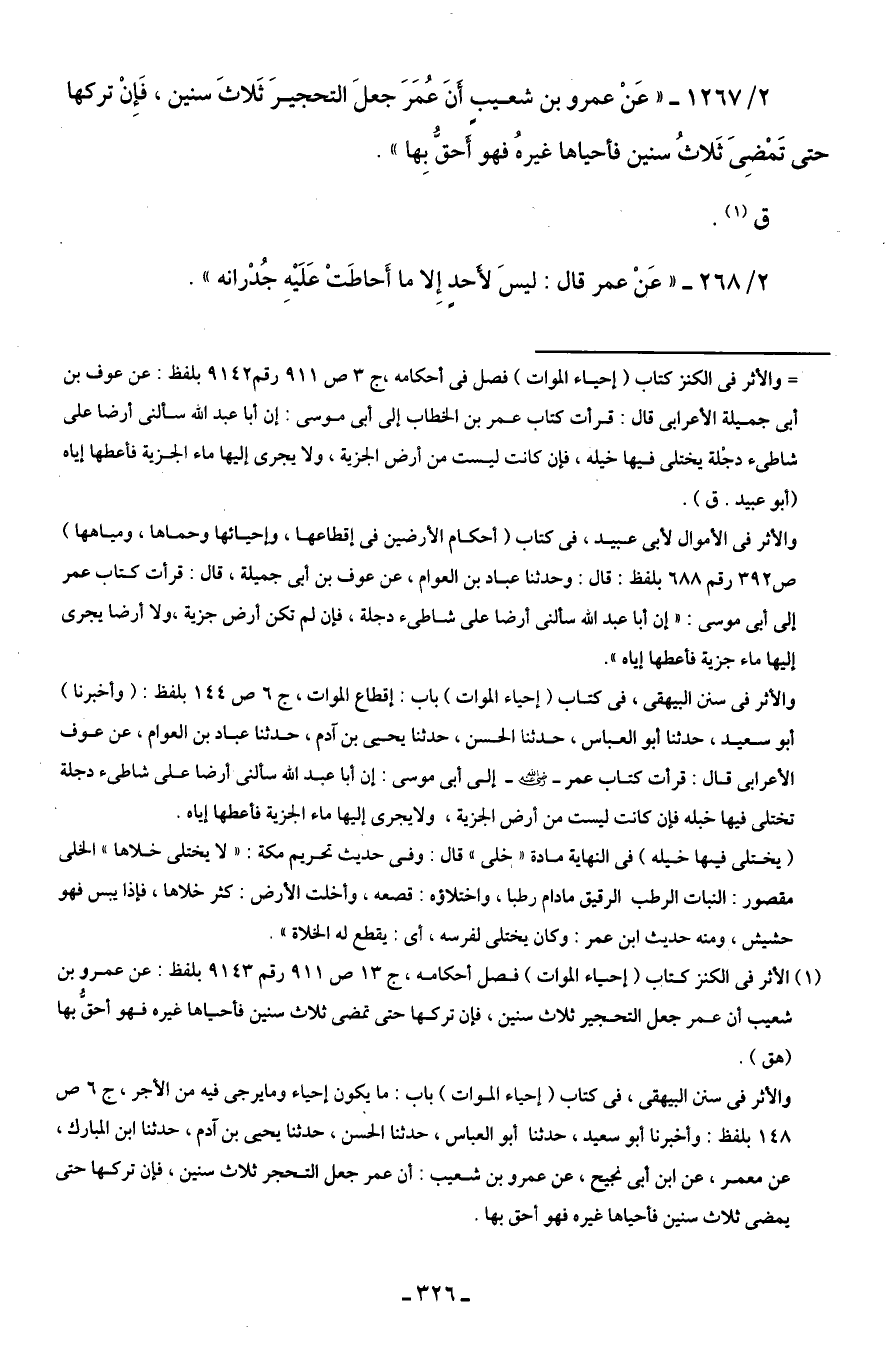 2/ 1267 - "عَنْ عمرو بن شعيبٍ أَنَ عُمَرَ جعلَ التحجيرَ ثَلاثَ سنين، فَإِنْ تركها حتى تَمْضِىَ ثَلاثُ سنين فأحياها غيرهُ فهو أَحقُّ بِها".