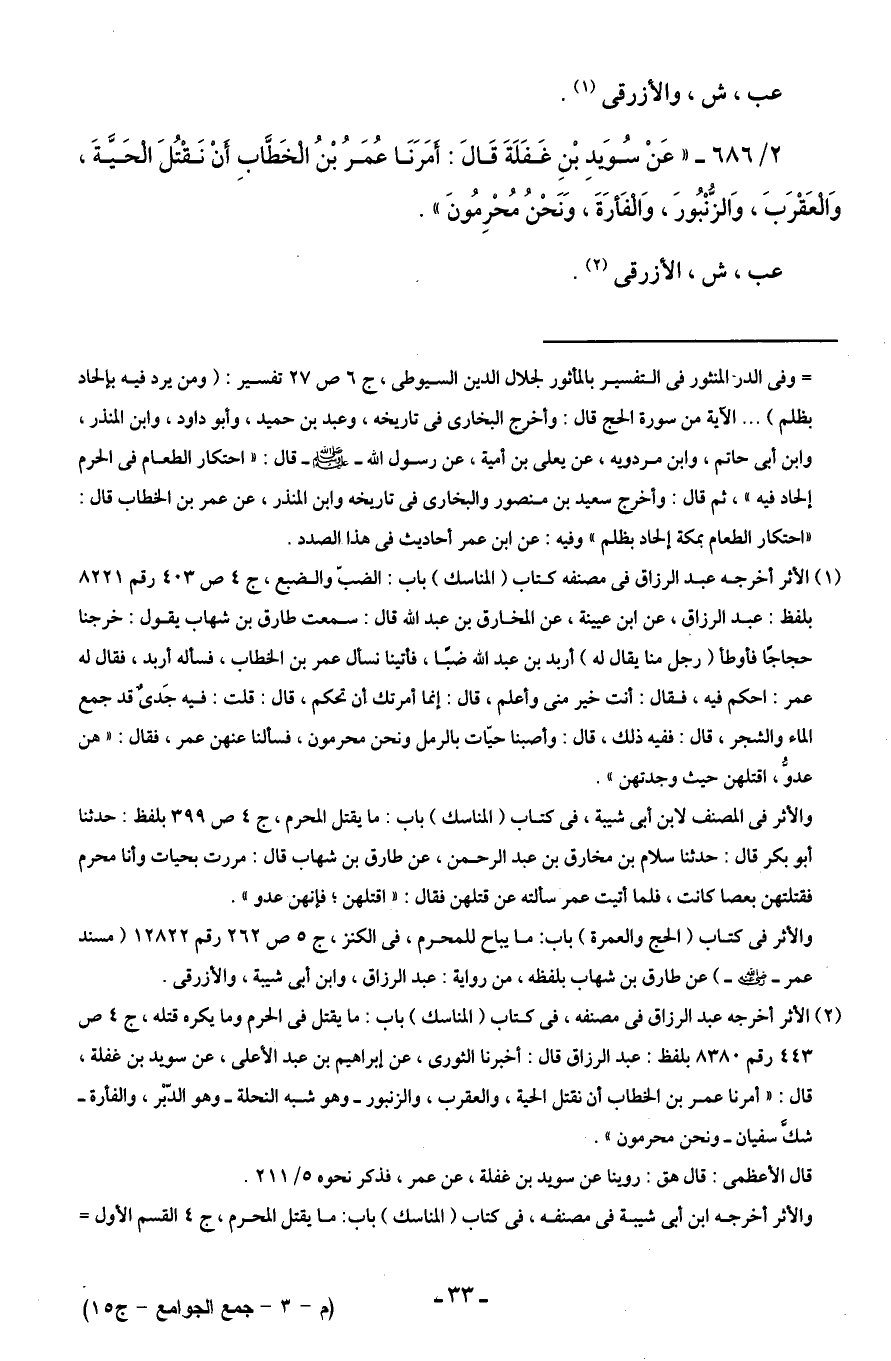 2/ 686 - "عَنْ سُوَيدِ بْنِ غَفَلَةَ قَالَ: أَمَرَنَا عُمَرُ بْنُ الْخَطَّابِ أَنْ نَقْتُلَ الْحَيَّةَ، وَالْعَقْرَبَ، وَالزُّنْبُورَ، وَالْفَأرَةَ، وَنَحْنُ مُحْرِمُونَ".