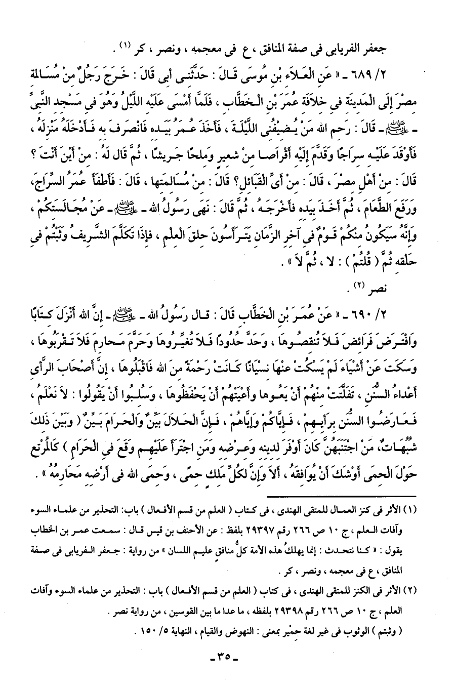 (¬1) الأثر في كنز العمال للمتقى الهندى، في كتاب (العلم من قسم الأفعال) باب: التحذير من علماء السوء وآفات العلم، ج 10 ص 266 رقم 29397 بلفظ: عن الأحنف بن قيس قال: سمعت عمر بن الخطاب يقول: "كنا نتحدث: إنما يهلكُ هذه الأمة كلُّ منافقٍ عليم اللسان" من رواية: جعفر الفريابي في صفة المنافق، ع في معجمه، ونصر، كر.