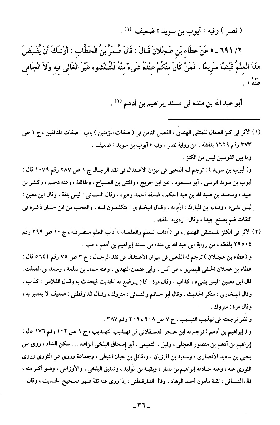 2/ 691 - "عَنْ عَطَاءِ بْنِ عَجْلانَ قَالَ: قَالَ عُمَرُ بْنُ الْخَطَّابِ: أَوْشَكَ أَنْ يُقْبَضَ هَذَا الْعِلْمُ قَبْضًا سَرِيعًا، فَمَنْ كَانَ مِنْكُمْ عِنْدَهُ شَيءٌ مِنْهُ فَلْتُفْشوه غَيْرَ الْغَالِي فِيهِ وَلَا الْجَافِي عَنْهُ".
