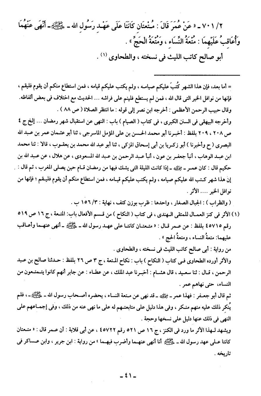 (¬1) الأثر في كنز العمال للمتقي الهندى، في كتاب (النكاح) من قسم الأفعال باب: المتعة، ج 16 ص 519 رقم 45715 بلفظ: عن عمر قال: "متعتان كانتا على عهد رسول الله - صلى الله عليه وسلم - أنهى عنهما وأعاقب عليهما: متعةُ النساء، ومتعةُ الحج".