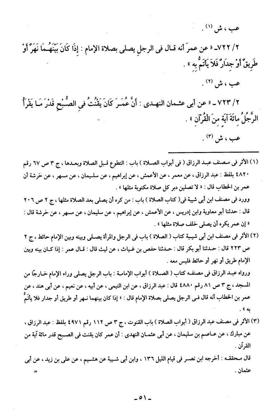 (¬3) الأثر في مصنف عبد الرزاق (أبواب الصلاة) باب القنوت، ج 3 ص 112 رقم 4971 بلفظ: عبد الرزاق، عن مبارك، عن عاصم بن سليمان، عن أبي عثمان النهدي: أن عمر كان يقنت في الصبح قدر مائة آية من القرآن.