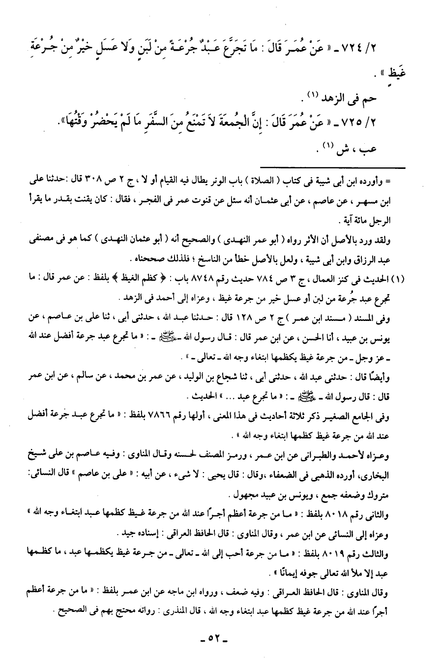 2/ 724 - "عَنْ عُمَرَ قَالَ: مَا تَجَرَّعَ عَبْدٌ جُرْعَةً مِنْ لَبَنٍ وَلا عَسَلٍ خيْرٌ مِنْ جُرْعَةِ غَيظٍ".