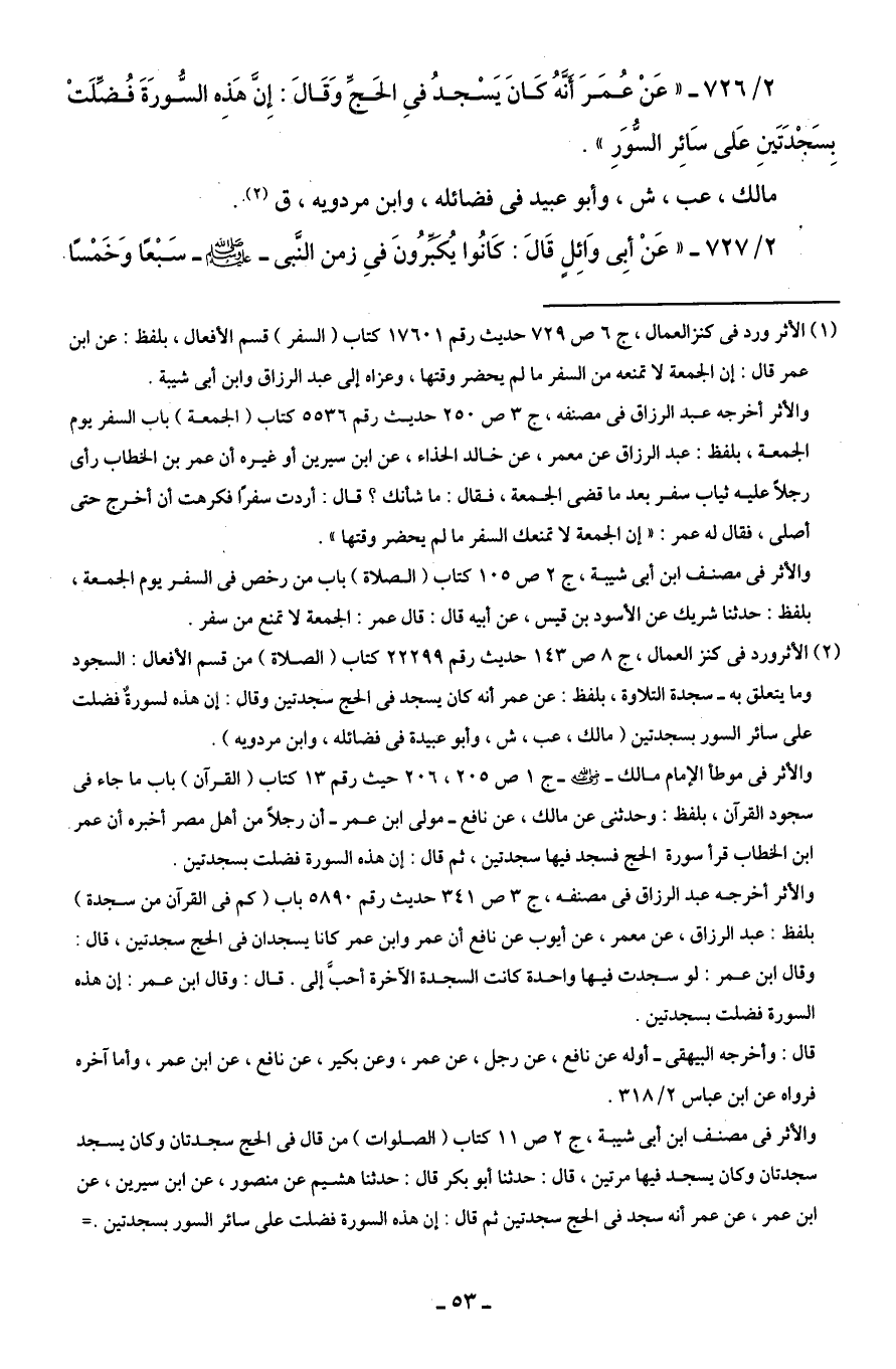 (¬2) الأثر ورد في كنز العمال، ج 8 ص 143 حديث رقم 22299 كتاب (الصلاة) من قسم الأفعال: السجود وما يتعلق به - سجدة التلاوة، بلفظ: عن عمر أنه كان يسجد في الحج سجدتين وقال: إن هذه لسورةٌ فضلت على سائر السور بسجدتين (مالك، عب، ش، وأبو عبيدة في فضائله، وابن مردويه).