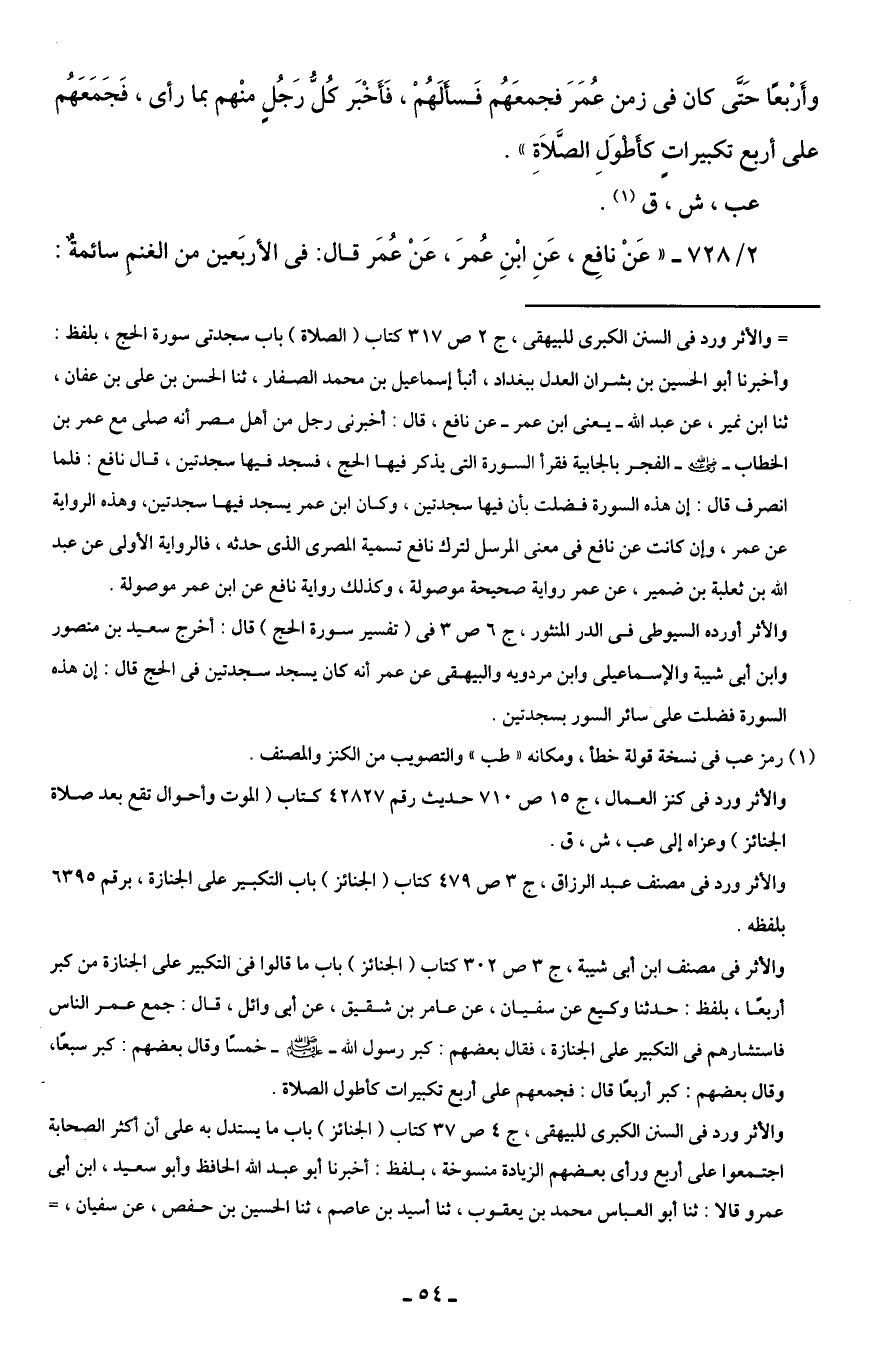 = والأثر ورد في السنن الكبرى للبيهقى، ج 2 ص 317 كتاب (الصلاة) باب سجدتى سورة الحج، بلفظ: وأخبرنا أبو الحسين بن بشران العدل ببغداد، أنبأ إسماعيل بن محمد الصفار، ثنا الحسن بن على بن عفان، ثنا ابن نمير، عن عبد الله - يعنى ابن عمر - عن نافع، قال: أخبرني رجل من أهل مصر أنه صلى مع عمر بن الخطاب - رضي الله عنه - الفجر بالجابية فقرأ السورة التى يذكر فيها الحج، فسجد فيها سجدتين، قال نافع: فلما انصرف قال: إن هذه السورة فضلت بأن فيها سجدتين، وكان ابن عمر يسجد فيها سجدتين، وهذه الرواية عن عمر، وإن كانت عن نافع في معنى المرسل لترك نافع تسمية المصري الدى حدثه، فالرواية الأولى عن عبد الله بن ثعلبة بن ضمير، عن عمر رواية صحيحة موصولة، وكذلك رواية نافع عن ابن عمر موصولة.