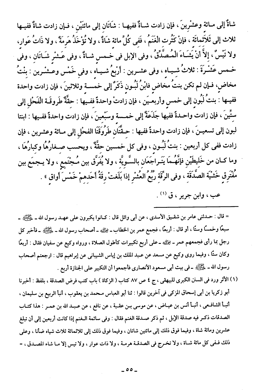 (¬1) الأثر ورد في السنن الكبرى للبيهقى، ج 4 ص 87 كتاب (الزكاة) باب كتب فرض الصدقة، بلفظ: أخبرنا أبو زكريا بن أبي إسحاق المزكى في آخرين قالوا: ثنا أبو العباس محمد بن يعقوب، أنبأ الربيع بن سليمان، أنبأ الشافعى، أنبأ أنس بن عياض، عن موسى بن عقبة، عن نافع، عن عبد الله بن عمر: هذا كتاب الصدقات ذكر فيه صدقة الإبل، ثم ذكر صدقة الغنم فقال: وفي سائمة الغنم إذا كانت أربعين إلى أن تبلغ عشرين ومائة شاة، وفيما فوق ذلك إلى مائتين شاتان، وفيما فوق ذلك إلى ثلاثمائة ثلاث شياه ضأنا، وعلى ذلك ففي كل مائة شاة، ولا تخرج في الصدقة هرمة، ولا ذات عوار، ولا تيس إلا ما شاء المصدق، =