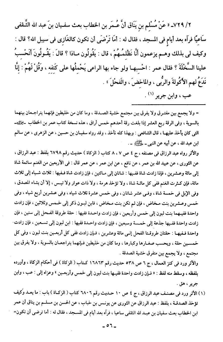 2/ 729 - "عَنْ مُسْلِم بنِ يَنَاق أنَّ عُمَر بن الخطاب بعث سفيان بنَ عبد الله الثَّقفى سَاعِيًا فرآه بعد أيامٍ في المسجد، فقال له: أمَا تَرْضَى أن تكون كالغَازِي في سبيل الله؟ قال: وكيف لى بذلك وهم يزعمون أنَّا نَظلِمُهُمْ، قال: يَقُولُون ماذا؟ قالَ: يَقولُونَ أَتَحْسِبُ علينا السَّخْلَةَ؟ فقال عمر: احْسِبها ولو جاء بها الراعي يَحْمِلُها على كَتِفِهِ، وَقُلْ لَهُمْ: إِنَّا نَدَعُ لهم الأَكُولةَ والرُّبى، والماخِضَ، والَفحْلَ".
