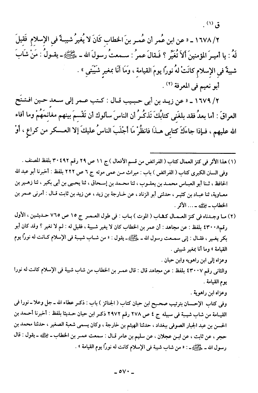 2/ 1678 - "عن ابن عُمر أن عُمر بنَ الخطابِ كَانَ لا يُغيرُ شيبةً فِى الإِسلاِمِ فَقِيلَ لَهُ: يا أميرَ المؤمنينَ أَلَا تُغيِّر؟ فَقالَ عمرُ: سمعتُ رسولَ اللَّه -صلى اللَّه عليه وسلم- يقولُ: مَنْ شَابَ شيبةً فِى الإِسلامِ كَانَتْ لهُ نورًا يومَ القيامةِ، وَمَا أَنَا بمغيرٍ شَيْبَتِى".