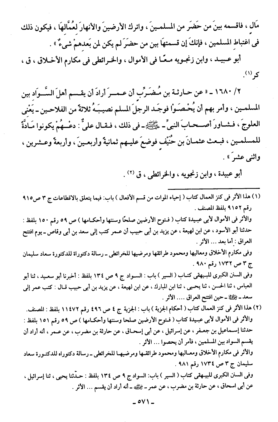 2/ 1680 - "عن حارثة بن مُضَرِّبٍ أن عمرَ أرادَ أن يقسم أهلَ السَّوَادِ بين المسلمين، وأمر بهم أن يُحْصَوْا فوجَد الرجلَ المسلم نصيبَهُ ثلاثةً من الفلاحين -يَعْنِى العلوجَ، فشاورَ أصحابَ النبىِّ -صلى اللَّه عليه وسلم- في ذلك، فقال علىٌّ: دعْهُمْ يكونوا مَادَّةً للمسلمين، فبعث عثمانَ بن حُنَيْفٍ فوضعَ عليهم ثمانيةً وأربعينَ، وأربعةً وعشرين، واثنى عشرَ".