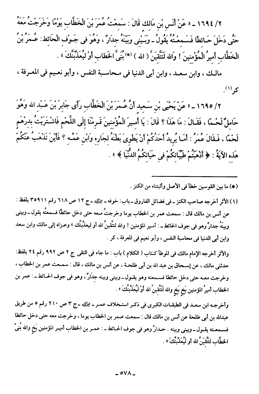 2/ 1694 - "عَنْ أَنَسِ بْنِ مَالِكٍ قَالَ: سَمِعْتُ عُمَرَ بْنَ الْخَطَّابِ يَوْمًا وَخَرَجْتُ مَعَهُ حَتَّى دَخَلَ حَائِطًا فَسَمِعْتُهُ يَقُولُ -وَبَيْنِى وَبَيْنَهُ جِدَارٌ، وَهُوَ في جَوْفِ الْحَائِط: عُمَرُ بْنُ الْخَطَّابِ أمِيرُ الْمُؤْمِنِينَ! وَاللَّه لَتَتَّقِيَنَّ (اللَّه) (*) بُنَىَّ الخَطابِ أَوْ ليُعَذِّبَنَّكَ".