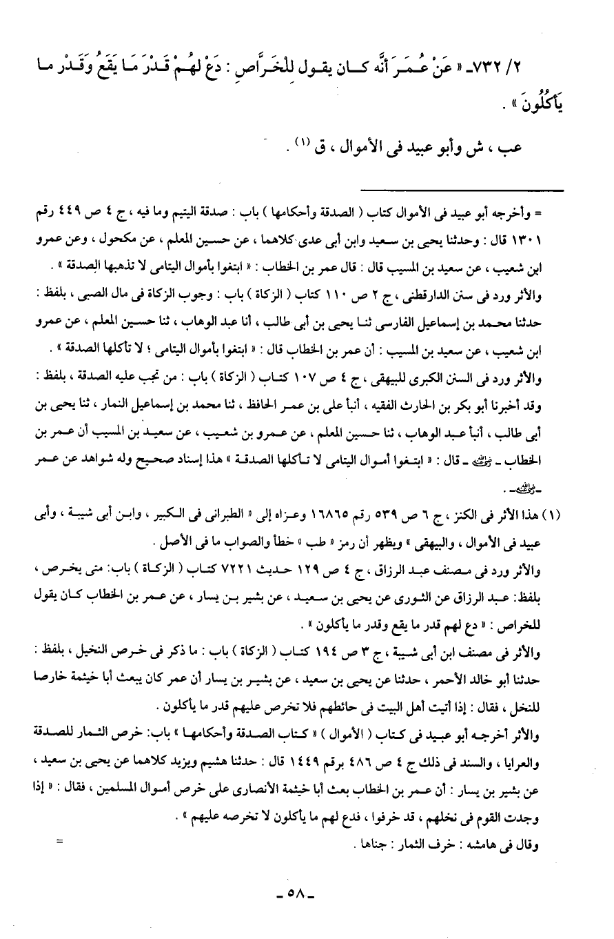 2/ 732 - "عَنْ عُمَرَ أنَّه كان يقول لِلْخَرَّاصِ: دَعْ لهُمْ قَدْرَ مَا يَقَعُ وَقَدْر ما يَأكُلُونَ".