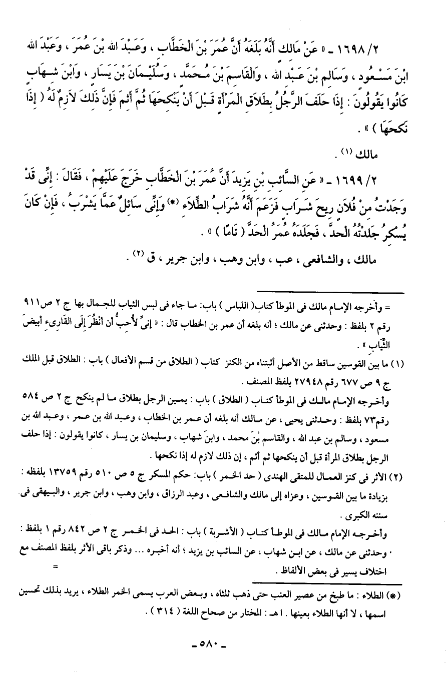 2/ 1699 - "عَنِ السَّائِبِ بْنِ يَزِيدَ أَنَّ عُمَرَ بْنَ الْخَطَّابِ خَرَجَ عَلَيْهِمْ، فَقَالَ: إِنِّى قَدْ وَجَدْتُ مِنْ فُلَانٍ رِيحَ شَرَاب فَزَعَمَ أَنَّهُ شَرَابُ الطِّلَاءِ (*) وَإنِّى سَائِلٌ عَمَّا يَشْرَبُ، فَإِنْ كَانَ يُسْكِرُ جَلدْتُهُ الْحدَّ، فَجَلَدَهُ عُمَرُ الْحَدَّ (تَامًا) ".