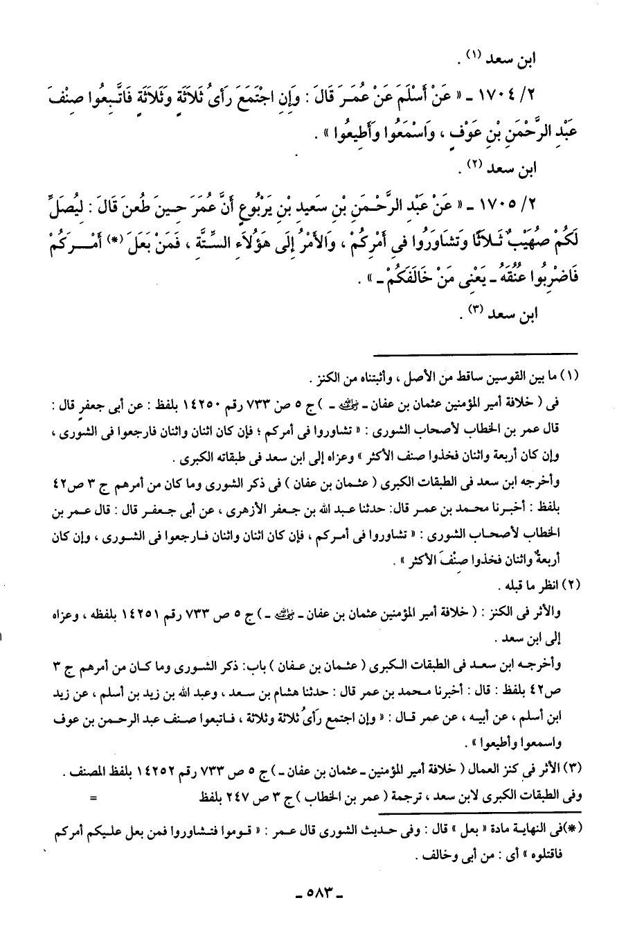 2/ 1705 - "عَنْ عَبْدِ الرَّحْمَنِ بْنِ سَعيدِ بْنِ يَرْبُوعٍ أَنَّ عُمَرَ حِينَ طُعنَ قَالَ: لِيُصَلِّ لَكُمْ صُهَيْبٌ ثَلاثًا وَتشَاوَرُوا فِى أَمْرِكُمْ، وَالأَمْرُ إِلَى هَؤُلَاءِ السِّتَّة، فَمَنْ بَعَلَ (*) أَمْرَكُمْ فَاضْرِبُوا عُنُقَهُ -يَعْنِى مَنْ خَالَفَكُمْ-".