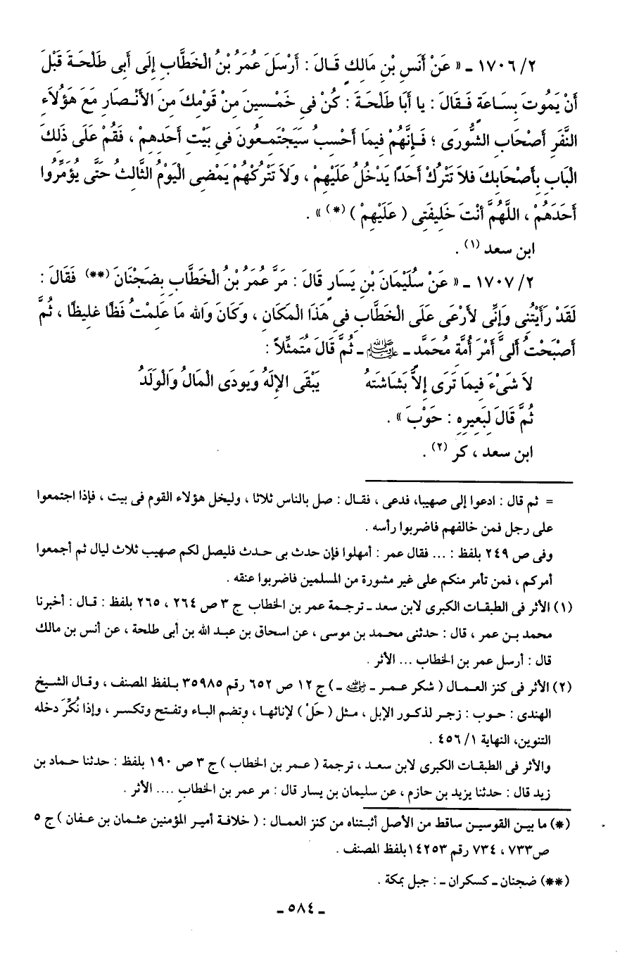 2/ 1706 - "عَنْ أَنَسِ بْنِ مَالكٍ قَالَ: أرْسَلَ عُمَرُ بْنُ الْخَطَّابِ إِلَى أَبِى طَلْحَةَ قَبْلَ أَنْ يَمُوتَ بِسَاعَةٍ فَقَالَ: يا أَبَا طَلحَةَ: كُنْ فِى خَمْسِينَ مِنْ قَوْمِكَ مِنَ الأَنْصَارِ مَعَ هَؤُلَاءِ النَّفَرِ أَصْحَابِ الشُّورَى؛ فَإِنَّهُمْ فِيمَا أَحْسِبُ سَيَجْتَمِعُونَ فِى بَيْتِ أَحَدهِمْ، فَقُمْ عَلَى ذَلكَ الْبَابِ بِأَصْحَابِكَ فلَا تَتْرُكْ أحَدًا يَدْخُلُ عَلَيْهِمْ، وَلَا تَتْرُكْهُمْ يَمْضِى الْيَوْمُ الثَّالِثُ حَتَّى يُؤَمِّرُوا أحَدَهُمْ، اللَّهُمَّ أَنْتَ خَلِيفَتِى (عَلَيْهِمْ) (*) ".