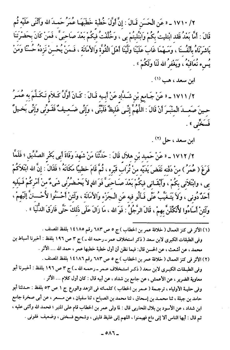 2/ 1710 - "عَن الْحَسَنِ قَالَ: إِنَّ أَوَّلَ خُطْبةٍ خَطَبَهَا عُمَرُ حَمِدَ اللَّه وَأَثْنَى عَلَيْهِ ثُم قَالَ: أَمَّا بَعْدُ فَقدِ ابْتليتُ بِكُمْ وَابْتُلِيتُمْ بِى، وَخُلِّفْتُ فيكُمْ بَعْدَ صَاحِبَىَّ، فَمَنْ كَانَ بِحَضْرَتِنَا بَاشَرْنَاهُ بِأَنْفُسِنَا، وَمَهْمَا غَابَ عَلَيْنَا وَلَّيْنَا أَهْلَ الْقُوَّةِ وَالأَمَانَةِ، فَمَنْ يُحْسِنْ نَزِدْهُ حُسْنًا وَمَنْ يُسِء نُعَاقِبْهُ، وَيَغْفِرُ اللَّه لَنَا وَلَكُمْ".