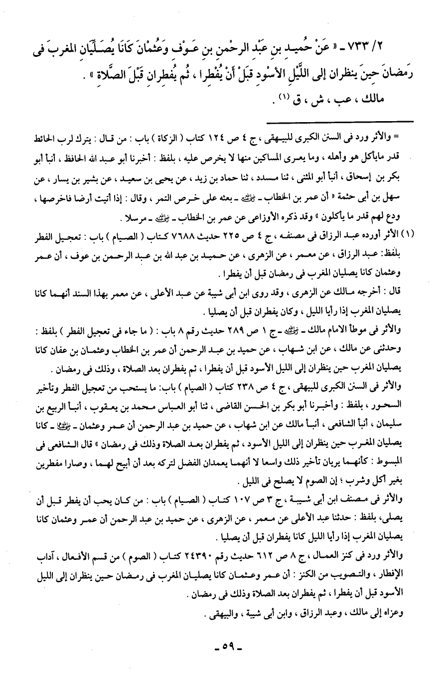 2/ 733 - "عَنْ حُميدِ بنِ عَبْدِ الرحْمنِ بنِ عَوْفِ وَعُثمَّانَ كَانَا يُصَلَّيَانِ المغربَ في رَمضانَ حِينَ ينظران إلى اللَّيْلِ الأسْودِ قبَلْ أَنْ يُفْطِرا، ثُم يُفطِرانِ قَبْلَ الصَّلاةِ".