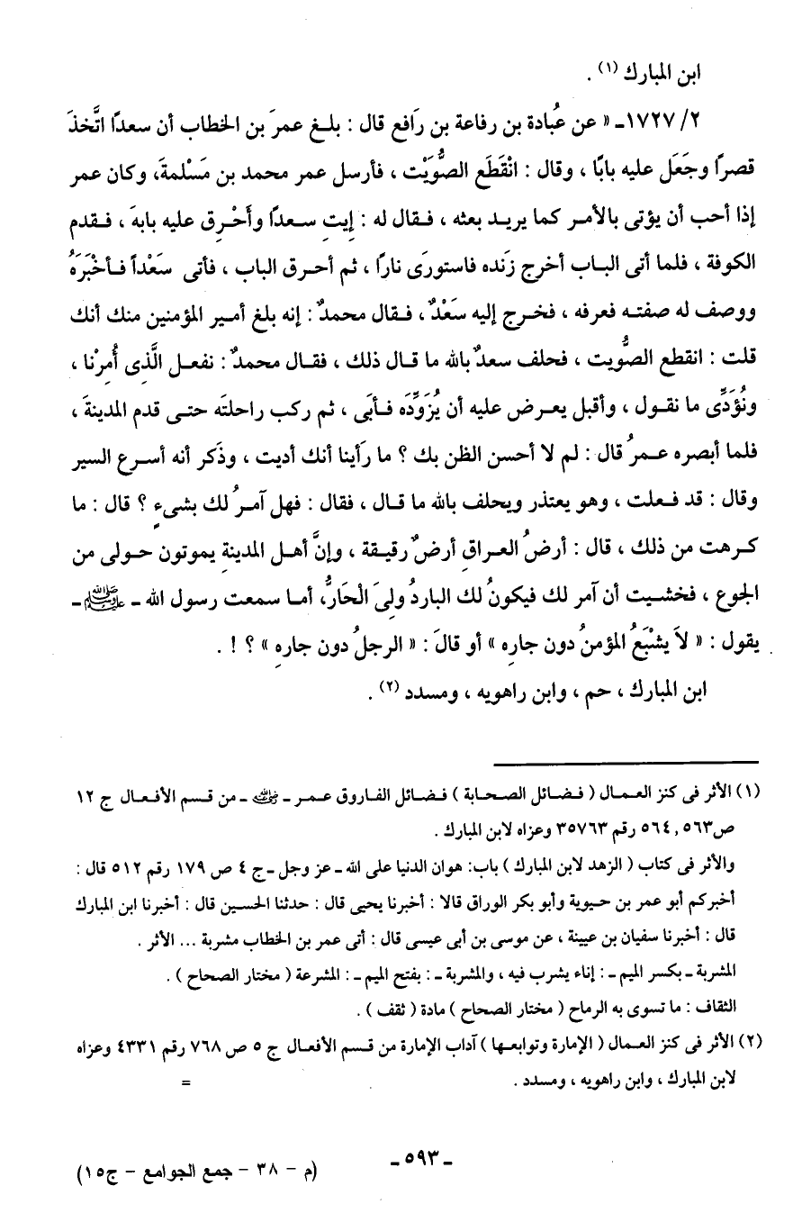 2/ 1727 - "عن عُبادة بن رفاعة بن رَافع قال: بلغ عمرَ بن الخطاب أن سعدًا اتَّخذَ قصرًا وجَعَل عليه بابًا، وقال: انْقَطَع الصُّوَيْت، فأرسل عمر محمد بن مَسْلمةَ، وكان عمر إذا أحب أن يؤتى بالأمر كما يريد بعثه، فقال له: إِيتِ سعدًا وأَحْرِق عليه بابه، فقدم الكوفة، فلما أتى الباب أخرج زَنده فاستورَى نارًا، ثم أحرق الباب، فأتى سَعْدًا فأخْبَرَهُ ووصف له صفته فعرفه، فخرج إليه سَعْدٌ، فقال محمدٌ: إنه بلغ أمير المؤمنين منك أنك قلت: انقطع الصُّويت، فحلف سعدٌ باللَّه ما قال ذلك، فقال محمدٌ: نفعل الَّذِى أُمرْنا، ونُؤَدِّى ما نقول، وأقبل يعرض عليه أن يُزَوِّدَه فأبَى، ثم ركب راحلتَه حتى قدم المدينةَ، فلما أبصره عمرُ قال: لم لا أحسن الظن بك؟ ما رَأينا أنك أديت، وذَكر أنه أسرع السير وقال: قد فعلت، وهو يعتذر ويحلف باللَّه ما قال، فقال: فهل آمرُ لك بشئٍ؟ قال: ما كرهت من ذلك، قال: أرضُ العراقِ أرضٌ رقيقة، وإنَّ أهل المدينةٍ يموتون حولى من الجوع، فخشيت أن آمر لك فيكون لك الباردُ ولِى الْحَارُّ، أما سمعت رسول اللَّه -صلى اللَّه عليه وسلم- يقول: "لَا يشْبَعُ المؤمنُ دون جارِه" أو قالَ: "الرجلُ دون جارهِ"؟ ! .