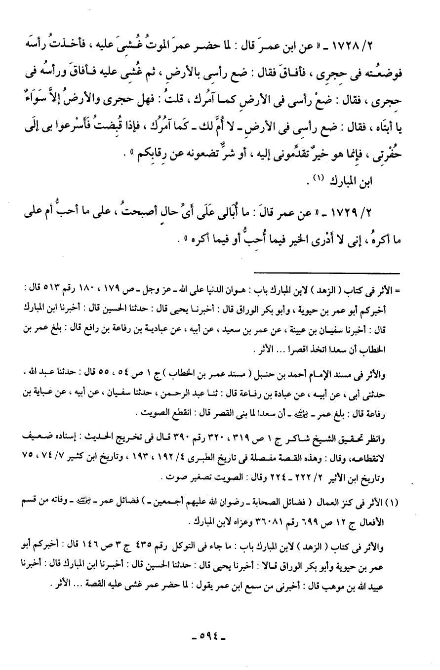2/ 1728 - "عن ابن عمرَ قال: لما حضر عمرَ الموتُ غُشِى عليه، فأخذتُ رأسَه فوضعته في حِجرِى، فأفاقَ فقال: ضع رأسِى بالأرضِ، ثم غُشِى عليه فأفاقَ ورأسُه في حِجرى، فقال: ضعْ رأسى في الأَرْضِ كما آمُرك، قلتُ: فهل حجرى والأرضُ إلَّا سَوَاءٌ يا أبتَاه، فقال: ضع رأسِى في الأَرْضِ -لا أُمَّ لك- كَما آمُرُك، فإذا قُبِضتُ فَأَسرعوا بى إلَى حُفْرتِى، فإِنما هو خَيْرٌ تقدِّمونى إليه، أو شرٌّ تضعونه عن رِقابِكم".