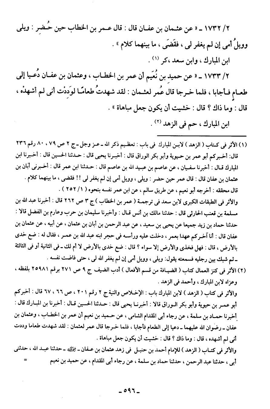 والأثر في كتاب (الزهد) لابن المبارك باب: الإخلاص والنية جـ 2 رقم 201، ص 66، 67 قال: أخبركم أبو عمر بن حيوية وأَبو بكر الوراق قالا: أخبرنا يحيى قال: حدثنا الحسين قال: أخبرنا بن المبارك قال: أخبرنا حماد بن سلمة، عن رجاء أَبى المقدام الشامى، عن حميد بن نعيم أن عمر بن الخطاب، وعثمان بن عفان -رضوان اللَّه عليهما- دعيا إلى الطعام فأجابا، فلما خرجا قال عمر لعئمان: لقد شهدت طعاما وددت أنى لم أشهده، قال: وما ذاك؟ قال: خشيت أن يكون جعل مباهاة.