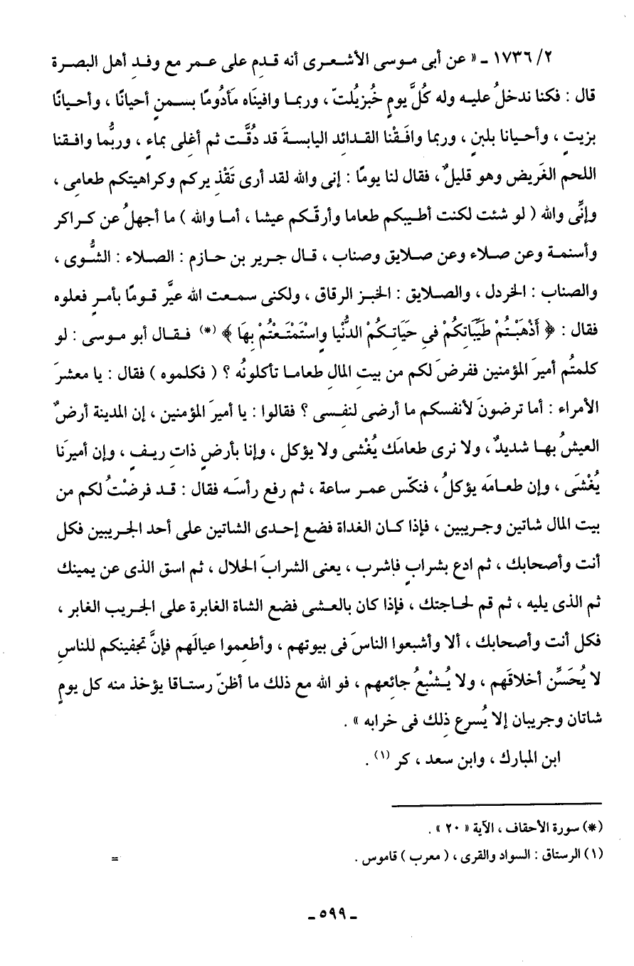 2/ 1736 - "عن أَبى موسى الأشعرى أنه قدِم على عمر مع وفدِ أهل البصرة قال: فكنا ندخلُ عليه وله كُلَّ يومٍ خُبز يُلتّ، وربما وافينَاه مَأدُومًا بسمنٍ أحيانًا، وأحيانًا بزيتٍ، وأحيانا بلبنٍ، وربما وافَقْنا القدائِد اليابسةَ قد دُقَّت ثم أغِلى بماءٍ، وربُّما وافقنا اللحم الغَريض وهو قليلٌ، فقال لنا يومًا: إنى واللَّه لقد أرى تَقْذِيركم وكراهيتكم طعامِى، وإنِّى واللَّه (لو شئت لكنت أطيبكم طعاما وأرقّكم عيشا، أما واللَّه) ما أجهلُ عن كراكر وأسنمة وعن صلاء وعن صلايق وصناب، قال جرير بن حازم: الصلاء: الشُّوى، والصناب: الخردل، والصلايق: الخبز الرقاق، ولكنى سمعت اللَّه عيَّر قومًا بأمرٍ فعلوه فقال: {أَذْهَبْتُمْ طَيِّبَاتِكُمْ فِى حَيَاتِكُمُ الدُّنْيَا وَاسْتَمْتَعْتُمْ بِهَا} (*) فقال أبو موسى: لو كلمتُم أميرَ المؤمنين ففرضَ لكم من بيتِ المالِ طعاما تأكلونُه؟ (فكلموه) فقال: يا معشرَ الأمراء: أما ترضونَ لأنفسكم ما أرضى لنفِسى؟ فقالوا: يا أميرَ المؤمنين، إن المدينة أرضٌ العيشُ بها شديدٌ، ولا نرى طعامَك يُغْشى ولا يؤكل، وإنا بأرضٍ ذاتِ ريفٍ، وإن أميرَنا يُغْشَى، وإن طعامَه يؤكلُ، فنكّس عمر ساعة، ثم رفع رأسَه فقال: قد فرضت لكم من بيت المال شاتين وجريبين، فإذا كان الغداة فضع إحدى الشاتين على أحد الجريبين فكل أنت وأصحابك، ثم ادع بشرابٍ فاشرب، يعنى الشرابَ الحلال، ثم اسق الذى عن يمينك ثم الذى يليه، ثم قم لحاجتك، فإذا كان بالعشى فضع الشاة الغابرة على الجريب الغابر، فكل أنت وأصحابك، ألا وأشبعوا النَّاسَ في بيوتهم، وأطعِموا عيالَهم فإنَّ تجفينكم للناسِ لا يحَسِّن أخلاقَهم، ولا يُشْبع جائِعهم، فواللَّه مع ذلك ما أظنّ رستاقا يؤخذ منه كل يومٍ شاتان وجريبان إلا يُسرع ذلك في خرابه".