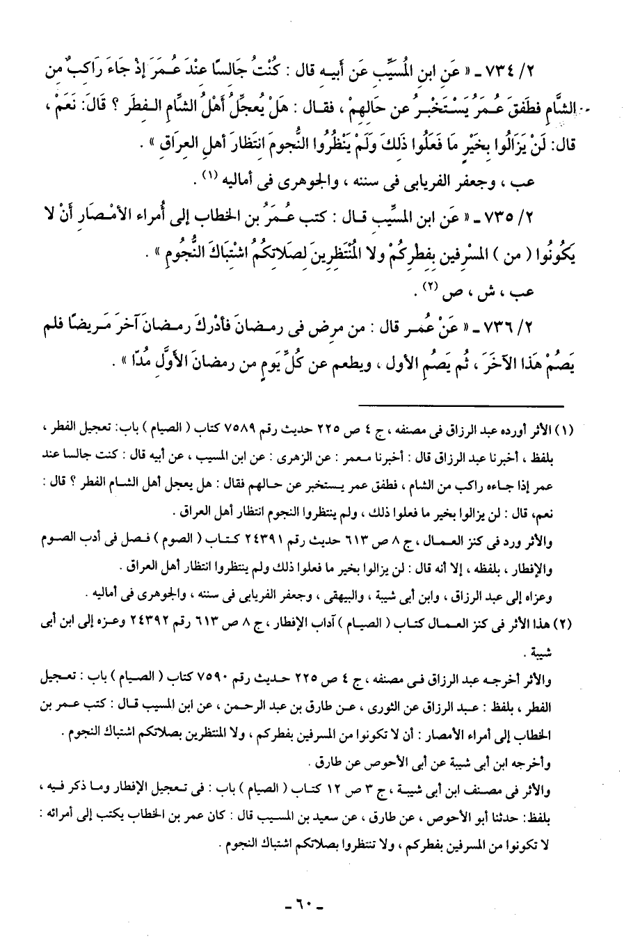 2/ 735 - "عَن ابن المسِّيبِ قال: كتب عُمَر بن الخطاب إلى أُمراء الأمْصَارِ أَنْ لا يَكُونُوا (من) المسْرِفين بِفِطْرِكُمْ ولا المُنْتَظِرِينَ لِصَلاِتكُمُ اشْتِبَاكَ النُّجُومِ".